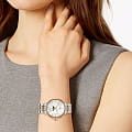 Роскошный перламутровый циферблат завораживает переливающимися оттенками, такое исполнение являет собой настоящую элегантность и особый стиль. Привлекательностью обладает и календарь, отображающий фазы луны. Подобное оформление идеально сочетается с необычным стальным браслетом. Часы работают за счёт высокоточного кварцевого калибра ETA F05.841. Стекло из сапфира имеет антибликовое покрытие. PVD-покрытиеPVDУльтратонкое покрытие наносится в технике вакуумного напыления, сочетает в себе нитрид титана особой прочности со слоем золота или оксида хрома. Несёт в себе декоративную или защитную функцию. корпуса и браслета, оттенок "розовое золото". Апертура даты. Диаметр корпуса: 34 мм.