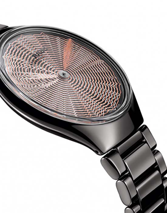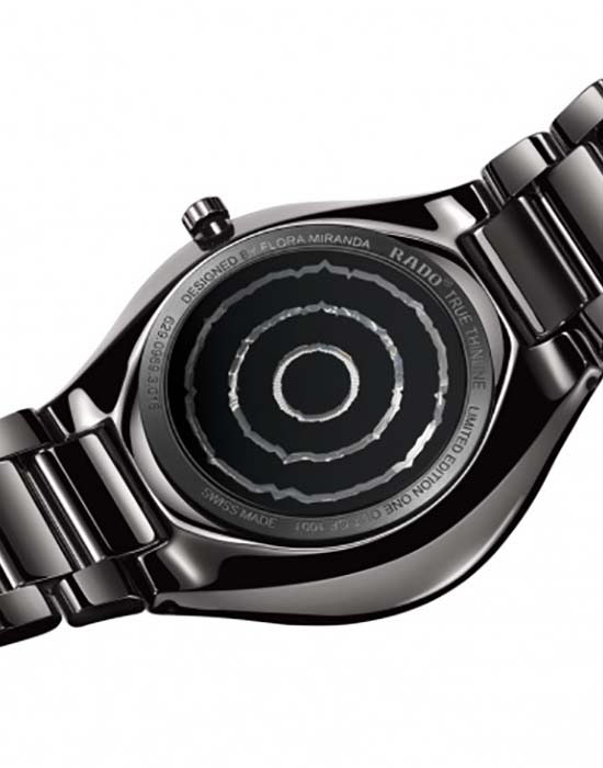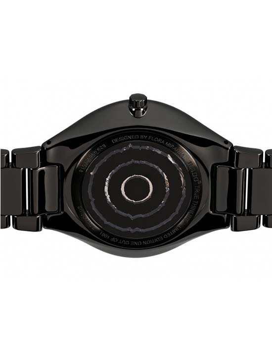 Ультратонкая модель Limited Edition (5 мм) отличается необычным циферблатом. Под сапфировым стеклом установлены 2 прозрачных диска, декорированных ажурным орнаментом, напоминающем паутину. Пересечение стрелок создаёт иллюзию наличия стрелок, что привело к рождению эксклюзивного аксессуара, способного приковывать взгляды окружающих. Швейцарский автоматический механизм ETA 2892-A2 с запасом хода 54 часа. Корпус и браслет из высокотехнологичной керамикиВысокотехнологичная керамикаИнновационный запатентованный Rado материал с гладкой или матовой поверхностью. Керамика за счёт кристаллической структуры обладает повышенной устойчивостью от возникновения царапин. Материал способен принимать температуру тела человека, обеспечивая невероятный комфорт при ношении.. Водонепроницаемость 3 бар. . Диаметр корпуса: 40 мм.