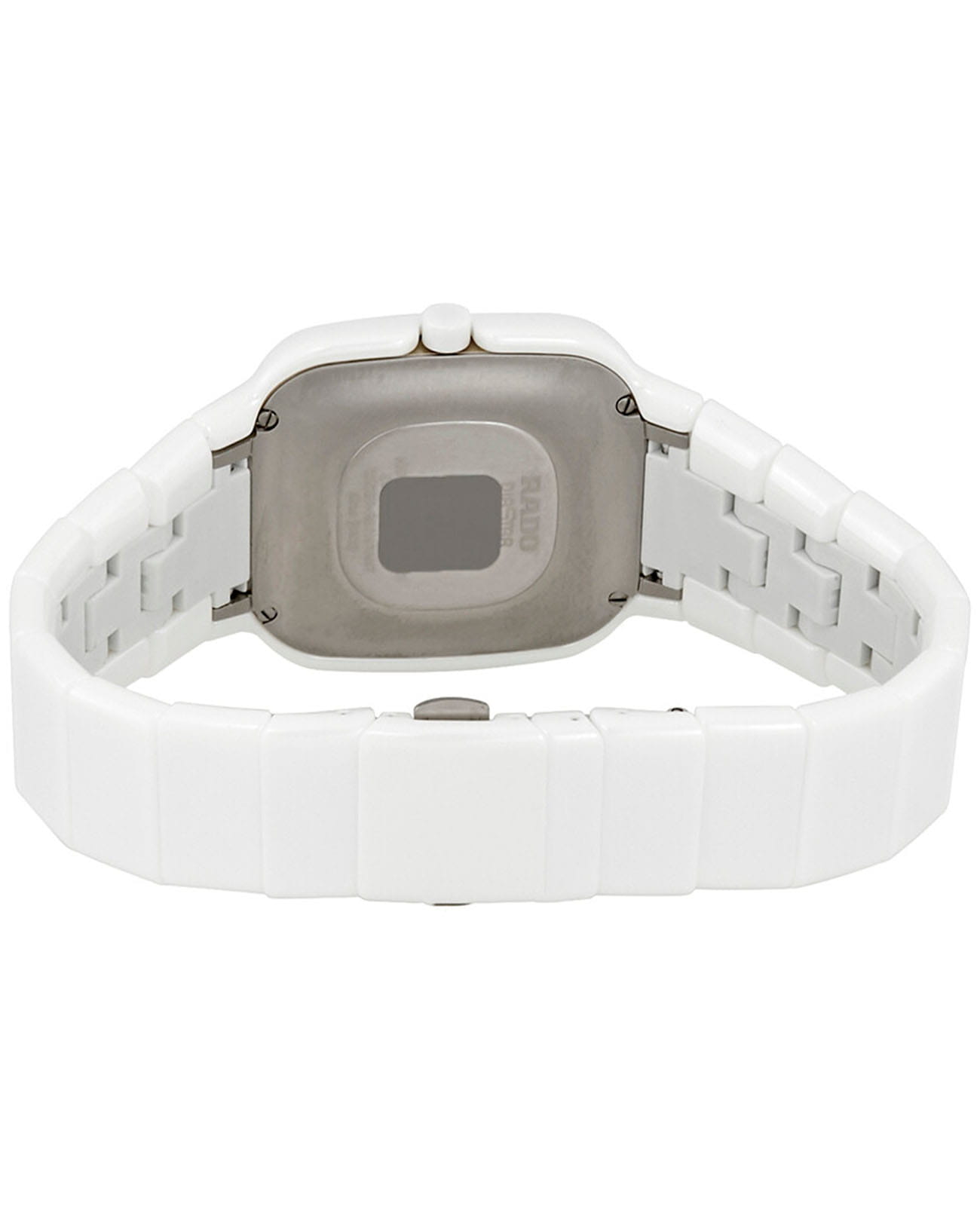 Швейцарские часы Rado R5.5 R28888152. Сапфировое стеклоСапфировое стеклоПрочный и надёжный материал из кристалла сапфира синтетического происхождения, характеризующийся особой твёрдостью и устойчивостью к царапинам и повреждениям. устойчивое к мелким механическим повреждениям. Корпус часов изготовлен из высокотехнологичной плазменной керамикиВысокотехнологичная плазменная керамикаИнновационный материал, технология запатентована. Выплавление керамики осуществляется в печи при 20 000 °C, белоснежный материал под воздействием ультравысокой температуры приобретает уникальный блеск, присущий металлам.. Стрелки и метки с люминесцентным покрытиемЛюминесцентное покрытиеПозволяет считывать показания времени в темноте. Производители наносят на стрелки, часовые индексы, безель или поверхность циферблата светонакопительный состав, дающий холодное свечение.. Класс водозащиты: 30 метров, позволит защитить корпус от случайных брызг или капель дождя. Браслет из высокотехнологичной плазменной керамикиВысокотехнологичная плазменная керамикаИнновационный материал, технология запатентована. Выплавление керамики осуществляется в печи при 20 000 °C, белоснежный материал под воздействием ультравысокой температуры приобретает уникальный блеск, присущий металлам. на раскладной застёжкеРаскладная застёжкаТакой тип застёжки используется только на браслетах из металла. Она никогда не раскрывается полностью, происходит разделение на 2 и более частей. Раскладывающая застёжка снизит вероятность потери часов к минимуму.. Циферблат декорирован 8 бриллиантами.