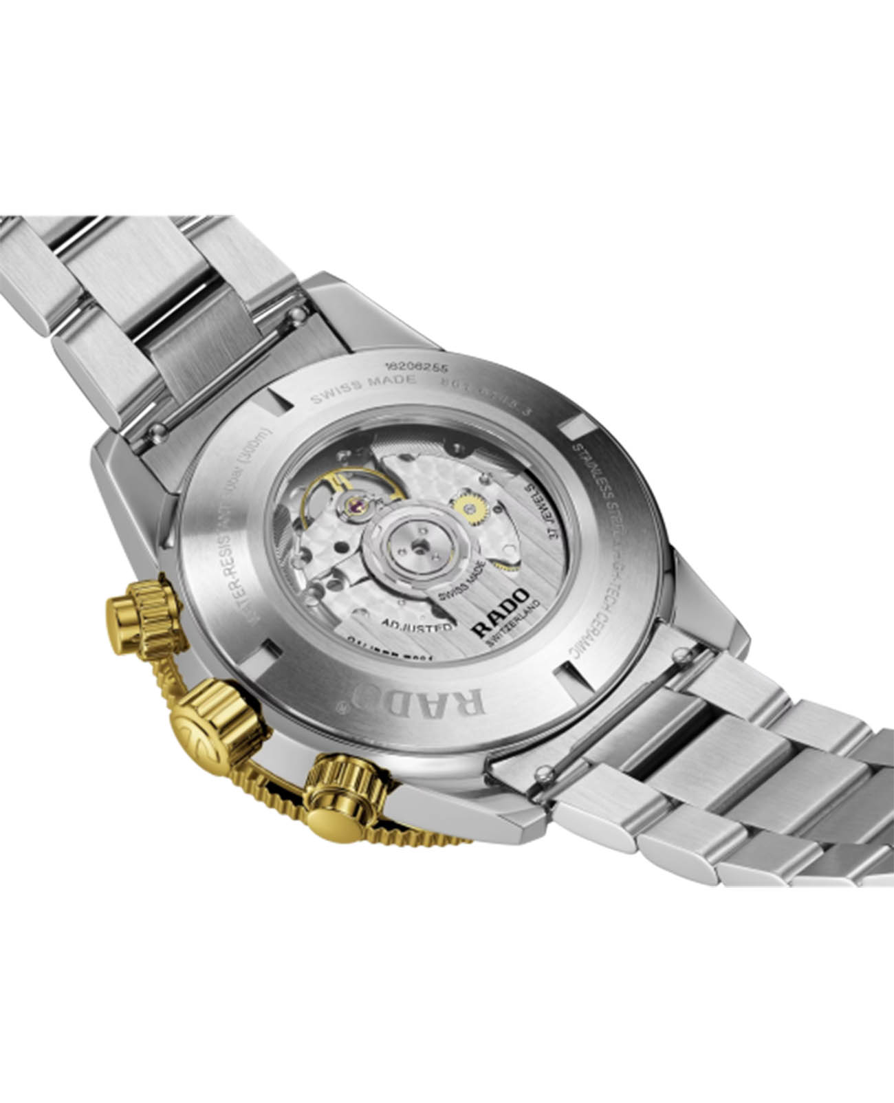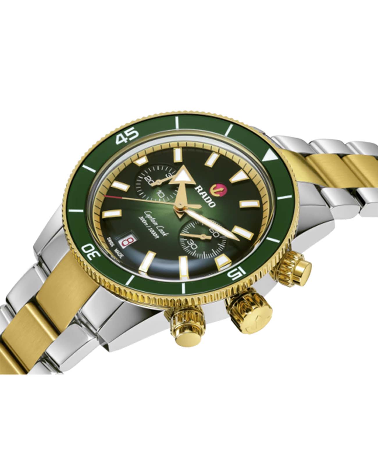 Мужские швейцарские механические часы-хронографХронографФункция позволяет измерять отрезки времени с особой точностью: часы, минуты, секунды. Верным признаком хронографа является наличие на циферблате 3 дополнительных окошек-счётчиков. Rado Captain Cook Automatic Chronograph R32151318. Сапфировое стеклоСапфировое стеклоПрочный и надёжный материал из кристалла сапфира синтетического происхождения, характеризующийся особой твёрдостью и устойчивостью к царапинам и повреждениям. устойчивое к мелким механическим повреждениям. Корпус часов изготовлен из нержавеющей стали. Стальной поворотный безельБезельВнешний ободок, закрепляющий стекло. В спортивных часах так называется поворотное кольцо с делениями на циферблате, выполняет роль таймера – замеряет отрезки времени на шкале. Неподвижный безель – элемент декора. Однонаправленно вращающийся безель на дайверских часах позволяет фиксировать моменты погружения и выныривания на поверхность. с PVD-покрытиемPVDУльтратонкое покрытие наносится в технике вакуумного напыления, сочетает в себе нитрид титана особой прочности со слоем золота или оксида хрома. Несёт в себе декоративную или защитную функцию.. Стрелки и метки с люминесцентным покрытиемЛюминесцентное покрытиеПозволяет считывать показания времени в темноте. Производители наносят на стрелки, часовые индексы, безель или поверхность циферблата светонакопительный состав, дающий холодное свечение.. Прозрачная задняя крышка. Класс водозащиты: 300 метров, позволит плавать, нырять и заниматься другими водными видами спорта. Стальной браслет с частичным PVD-покрытиемPVDУльтратонкое покрытие наносится в технике вакуумного напыления, сочетает в себе нитрид титана особой прочности со слоем золота или оксида хрома. Несёт в себе декоративную или защитную функцию. на раскладной застёжкеРаскладная застёжкаТакой тип застёжки используется только на браслетах из металла. Она никогда не раскрывается полностью, происходит разделение на 2 и более частей. Раскладывающая застёжка снизит вероятность потери часов к минимуму..