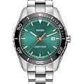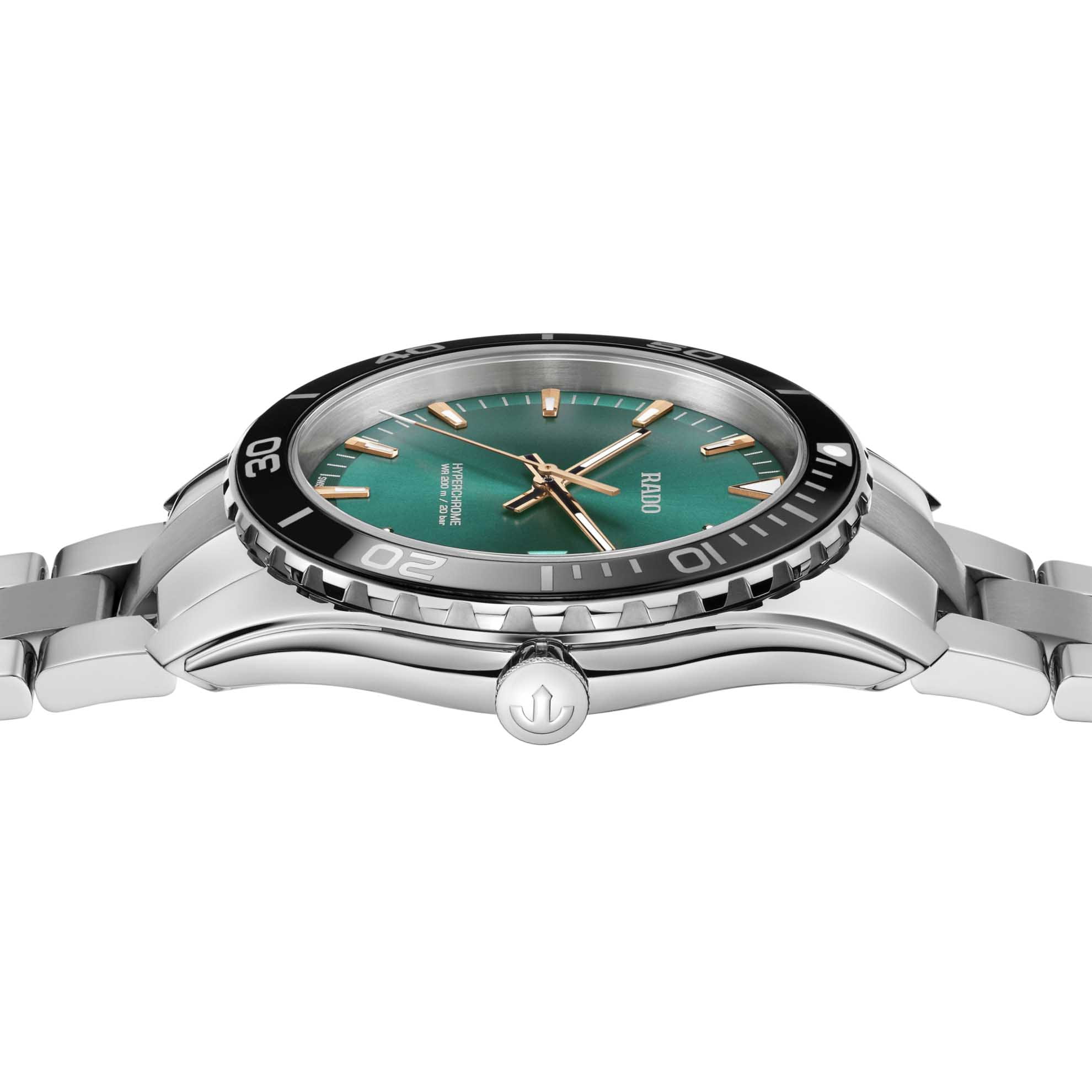 Мужские кварцевые часы Rado HyperChrome — это стильный и современный аксессуар с динамичным дизайном. Корпус диаметром 44 мм и толщиной 11,7 мм выполнен из нержавеющей стали. БезельБезельВнешний ободок, закрепляющий стекло. В спортивных часах так называется поворотное кольцо с делениями на циферблате, выполняет роль таймера – замеряет отрезки времени на шкале. Неподвижный безель – элемент декора. Однонаправленно вращающийся безель на дайверских часах позволяет фиксировать моменты погружения и выныривания на поверхность. — комбинированный, из нержавеющей стали с PVD-покрытиемPVDУльтратонкое покрытие наносится в технике вакуумного напыления, сочетает в себе нитрид титана особой прочности со слоем золота или оксида хрома. Несёт в себе декоративную или защитную функцию., с метками из Super-Luminova®. Циферблат зелёного цвета оформлен индексами и стрелками с люминесцентным покрытиемЛюминесцентное покрытиеПозволяет считывать показания времени в темноте. Производители наносят на стрелки, часовые индексы, безель или поверхность циферблата светонакопительный состав, дающий холодное свечение. Super-Luminova®, обеспечивающим хорошую читаемость в темноте. Циферблат защищён сапфировым стекломСапфировое стеклоПрочный и надёжный материал из кристалла сапфира синтетического происхождения, характеризующийся особой твёрдостью и устойчивостью к царапинам и повреждениям. с антибликовым покрытиемАнтибликовое покрытиеСлой оксида металла в 0,13-0,3 микрон, благодаря которому стекло часов не бликует и не отражает свет. Антибликовое покрытие уменьшает отражение света в 10 раз, обеспечивая отличную читаемость показателей циферблата.. Механизм — кварцевый калибр R073. Водонепроницаемость 200 wr, что позволяет плавать и нырять. Часы оснащены браслетом из нержавеющей стали и застёжкой «бабочка» с кнопкамиЗастёжка "бабочка"Такой вид застёжки дополняется предохранителями, помогающими избежать случайного раскрытия браслета. Обладают изящным исполнением. из титана и нержавеющей стали. Окошко даты расположено в положении 3 часов. Универсальный выбор для тех, кто ценит элегантность, надёжность и современный стиль.