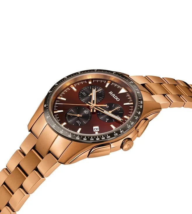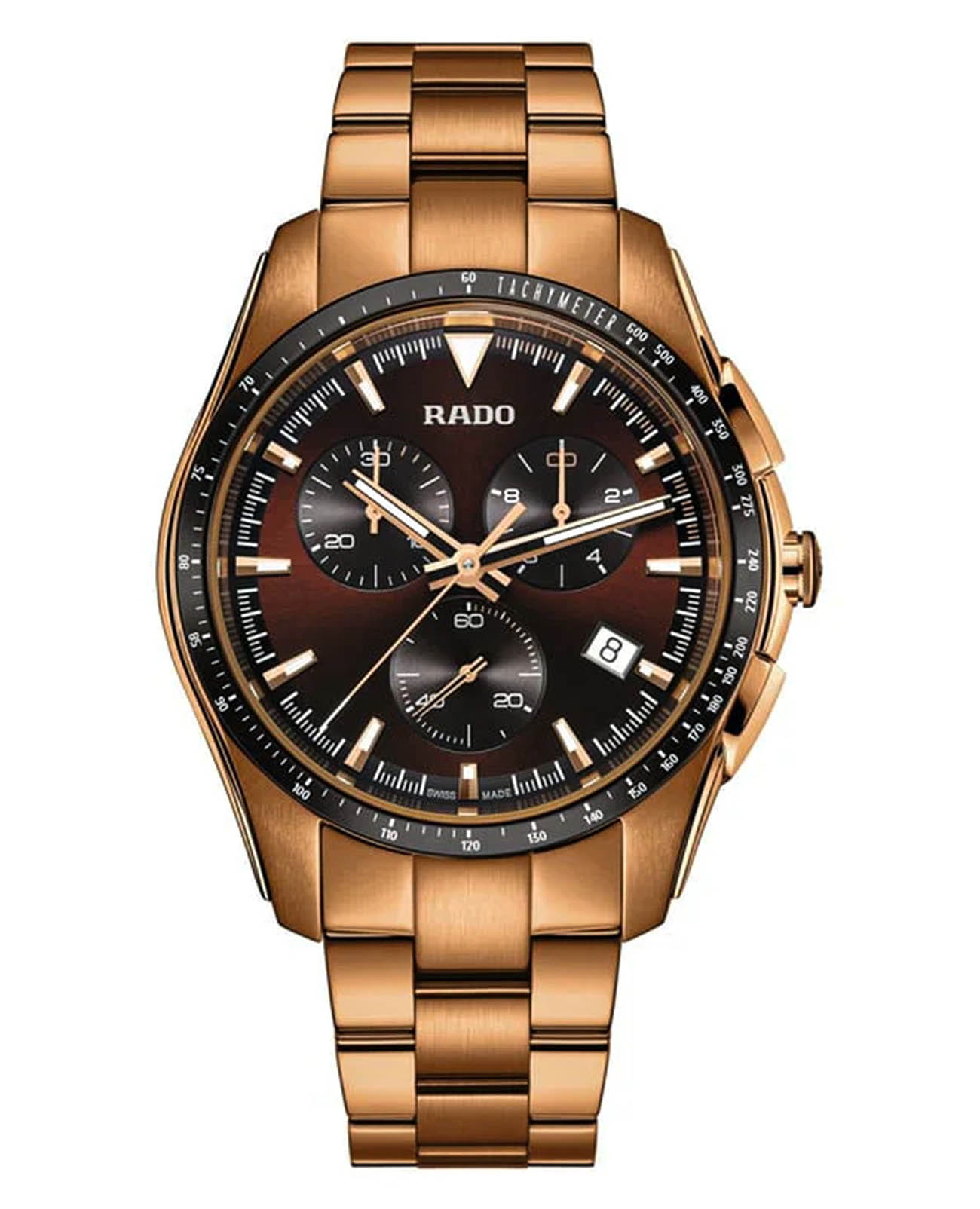 Мужские наручные часы-хронографХронографФункция позволяет измерять отрезки времени с особой точностью: часы, минуты, секунды. Верным признаком хронографа является наличие на циферблате 3 дополнительных окошек-счётчиков. Rado Hyperchrome Chronograph. Корпус часов изготовлен из нержавеющей стали с PVD-покрытиемPVDУльтратонкое покрытие наносится в технике вакуумного напыления, сочетает в себе нитрид титана особой прочности со слоем золота или оксида хрома. Несёт в себе декоративную или защитную функцию.. Стальной браслет с PVD-покрытиемPVDУльтратонкое покрытие наносится в технике вакуумного напыления, сочетает в себе нитрид титана особой прочности со слоем золота или оксида хрома. Несёт в себе декоративную или защитную функцию. на застёжкой «бабочка» с кнопкамиЗастёжка "бабочка"Такой вид застёжки дополняется предохранителями, помогающими избежать случайного раскрытия браслета. Обладают изящным исполнением. . БезельБезельВнешний ободок, закрепляющий стекло. В спортивных часах так называется поворотное кольцо с делениями на циферблате, выполняет роль таймера – замеряет отрезки времени на шкале. Неподвижный безель – элемент декора. Однонаправленно вращающийся безель на дайверских часах позволяет фиксировать моменты погружения и выныривания на поверхность. со шкалой тахиметраТахиметрРазмеченная шкала, располагается на ободке или безеле часов. Тахиметр позволяет рассчитать скорость на определённом участке пути, расстояние измеряется в километрах или милях.. Окошко даты находится в положении 4 часа. Стрелки и метки с люминесцентным покрытиемЛюминесцентное покрытиеПозволяет считывать показания времени в темноте. Производители наносят на стрелки, часовые индексы, безель или поверхность циферблата светонакопительный состав, дающий холодное свечение.. Сапфировое стеклоСапфировое стеклоПрочный и надёжный материал из кристалла сапфира синтетического происхождения, характеризующийся особой твёрдостью и устойчивостью к царапинам и повреждениям. с антибликовым покрытиемАнтибликовое покрытиеСлой оксида металла в 0,13-0,3 микрон, благодаря которому стекло часов не бликует и не отражает свет. Антибликовое покрытие уменьшает отражение света в 10 раз, обеспечивая отличную читаемость показателей циферблата. устойчивое к мелким механическим повреждениям. Класс водозащиты: 100 метров, позволит плавать, нырять и заниматься другими водными видами спорта.