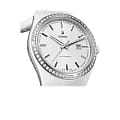 Женские механические швейцарские часы с автоподзаводом Rado Hyperchrome Automatic Diamonds R32483012. Сапфировое стеклоСапфировое стеклоПрочный и надёжный материал из кристалла сапфира синтетического происхождения, характеризующийся особой твёрдостью и устойчивостью к царапинам и повреждениям. устойчивое к мелким механическим повреждениям. Корпус часов изготовлен из нержавеющей стали и керамики. БезельБезельВнешний ободок, закрепляющий стекло. В спортивных часах так называется поворотное кольцо с делениями на циферблате, выполняет роль таймера – замеряет отрезки времени на шкале. Неподвижный безель – элемент декора. Однонаправленно вращающийся безель на дайверских часах позволяет фиксировать моменты погружения и выныривания на поверхность. и корпус украшены бриллиантами. Окошко даты находится в положении 3 часа. Стрелки с люминесцентным покрытиемЛюминесцентное покрытиеПозволяет считывать показания времени в темноте. Производители наносят на стрелки, часовые индексы, безель или поверхность циферблата светонакопительный состав, дающий холодное свечение.. Класс водозащиты: 50 метров, позволит защитить корпус от случайных брызг или капель дождя. Браслет из высокотехнологичной керамикиВысокотехнологичная керамикаИнновационный запатентованный Rado материал с гладкой или матовой поверхностью. Керамика за счёт кристаллической структуры обладает повышенной устойчивостью от возникновения царапин. Материал способен принимать температуру тела человека, обеспечивая невероятный комфорт при ношении. на раскладной застёжкеРаскладная застёжкаТакой тип застёжки используется только на браслетах из металла. Она никогда не раскрывается полностью, происходит разделение на 2 и более частей. Раскладывающая застёжка снизит вероятность потери часов к минимуму..