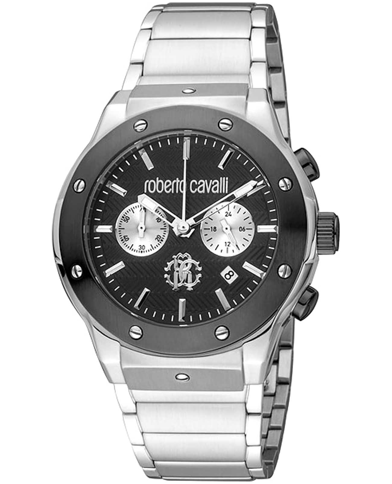 ROBERTO CAVALLI Ottimale RC5G045M0075 — стильные итальянские часы с функцией хронографаХронографФункция позволяет измерять отрезки времени с особой точностью: часы, минуты, секунды. Верным признаком хронографа является наличие на циферблате 3 дополнительных окошек-счётчиков., которые сочетают в себе элегантность и современный функционал. Круглый корпус диаметром 42 мм выполнен из нержавеющей стали, толщина корпуса составляет 12 мм, что придает модели выразительный внешний вид и надежную защиту от внешних воздействий. Часы оснащены кварцевым механизмом, также обладают функцией отображения даты и 24-часовой указатель времени, что делает их удобными для ежедневного использования. Минеральное стеклоМинеральное стеклоМинеральное стекло представляет собой искусственно выращенный минерал кварца. Такое стекло отличается особой устойчивостью к повреждениям и царапинам. Уступает по некоторым качествам сапфировому стеклу. защищает часы от царапин. Водозащита 100 метров, позволит плавать, нырять и заниматься другими водными видами спорта. Неподвижный безельБезельВнешний ободок, закрепляющий стекло. В спортивных часах так называется поворотное кольцо с делениями на циферблате, выполняет роль таймера – замеряет отрезки времени на шкале. Неподвижный безель – элемент декора. Однонаправленно вращающийся безель на дайверских часах позволяет фиксировать моменты погружения и выныривания на поверхность. с PVD-покрытиемPVDУльтратонкое покрытие наносится в технике вакуумного напыления, сочетает в себе нитрид титана особой прочности со слоем золота или оксида хрома. Несёт в себе декоративную или защитную функцию.. Стальной браслет на застёжке-бабочке с кнопкамиЗастёжка "бабочка"Такой вид застёжки дополняется предохранителями, помогающими избежать случайного раскрытия браслета. Обладают изящным исполнением. обеспечивает комфортное ношение. Стрелки с люминесцентным покрытиемЛюминесцентное покрытиеПозволяет считывать показания времени в темноте. Производители наносят на стрелки, часовые индексы, безель или поверхность циферблата светонакопительный состав, дающий холодное свечение. обеспечивают отличную читаемость в любое время суток.