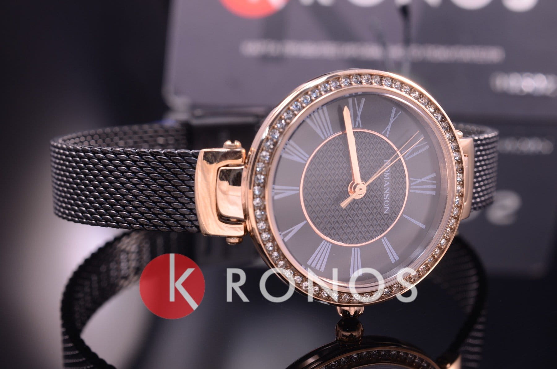 Модель в стиле fashion имеет привлекательный циферблат с узорчатой серединкой. БезельБезельВнешний ободок, закрепляющий стекло. В спортивных часах так называется поворотное кольцо с делениями на циферблате, выполняет роль таймера – замеряет отрезки времени на шкале. Неподвижный безель – элемент декора. Однонаправленно вращающийся безель на дайверских часах позволяет фиксировать моменты погружения и выныривания на поверхность. декорирован цирконами, добавляющими настроение праздника. Кварцевый механизм. Браслет необычного плетения. Минеральное стекло. Розовое и чёрное PVD-покрытиеPVDУльтратонкое покрытие наносится в технике вакуумного напыления, сочетает в себе нитрид титана особой прочности со слоем золота или оксида хрома. Несёт в себе декоративную или защитную функцию.. Водонепроницаемость 30 метров.