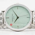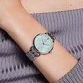 Женские кварцевые часы. Центральные часовая, минутная и секундная стрелки. Бирюзовый циферблат. Круглый корпус выполнен из полированной нержавеющей стали серебристого цвета. Диаметр корпуса составляет 33 мм. Стальной браслет с ювелирной застежкой. Прочное минеральное стеклоМинеральное стеклоМинеральное стекло представляет собой искусственно выращенный минерал кварца. Такое стекло отличается особой устойчивостью к повреждениям и царапинам. Уступает по некоторым качествам сапфировому стеклу. устойчивое к мелким механическим повреждениям. Водостойкость WR 30 (брызги).