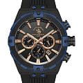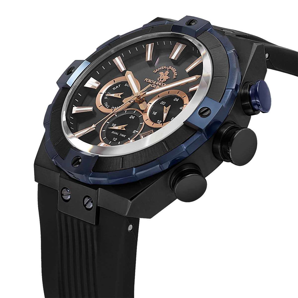 Мужские кварцевые часы-хронограф Santa Barbara Polo & Racquet Club — это смелый и массивный аксессуар. Корпус размером 45 мм и толщиной 14 мм выполнен из нержавеющей стали с IP-покрытиемIP-покрытиеМетод ионного напыления. Демонстрирует повышенную устойчивость к истиранию, окислению и химическим веществам. Под воздействием высокого давления и температуры около 1500°C молекулы металла надёжно соединяются с частицами корпуса часов.. Циферблат чёрного цвета выполнен по технологии Sunray («солнечные лучи») и оформлен штрихами, стрелками и тремя субциферблатами хронографа. Окошко даты расположено между 4 и 5 часами. Присутствуют отдельные индикаторы дня недели и второго часового пояса (GMTВторой часовой поясФункция, позволяющая отображать время двух часовых поясов одновременно.). Стрелки и метки с люминесцентным покрытиемЛюминесцентное покрытиеПозволяет считывать показания времени в темноте. Производители наносят на стрелки, часовые индексы, безель или поверхность циферблата светонакопительный состав, дающий холодное свечение., обеспечивающим хорошую читаемость в темноте. Циферблат защищён минеральным стекломМинеральное стеклоМинеральное стекло представляет собой искусственно выращенный минерал кварца. Такое стекло отличается особой устойчивостью к повреждениям и царапинам. Уступает по некоторым качествам сапфировому стеклу.. Механизм — кварцевый калибр Miyota JP25-4.5. Завинчивающаяся заводная головка повышает водонепроницаемость. Часы оснащены силиконовым ремешком на классической пряжке. Водонепроницаемость 50 м позволяет использовать часы в повседневных условиях. Идеальный выбор для тех, кто ценит американское качество и брутальный дизайн.