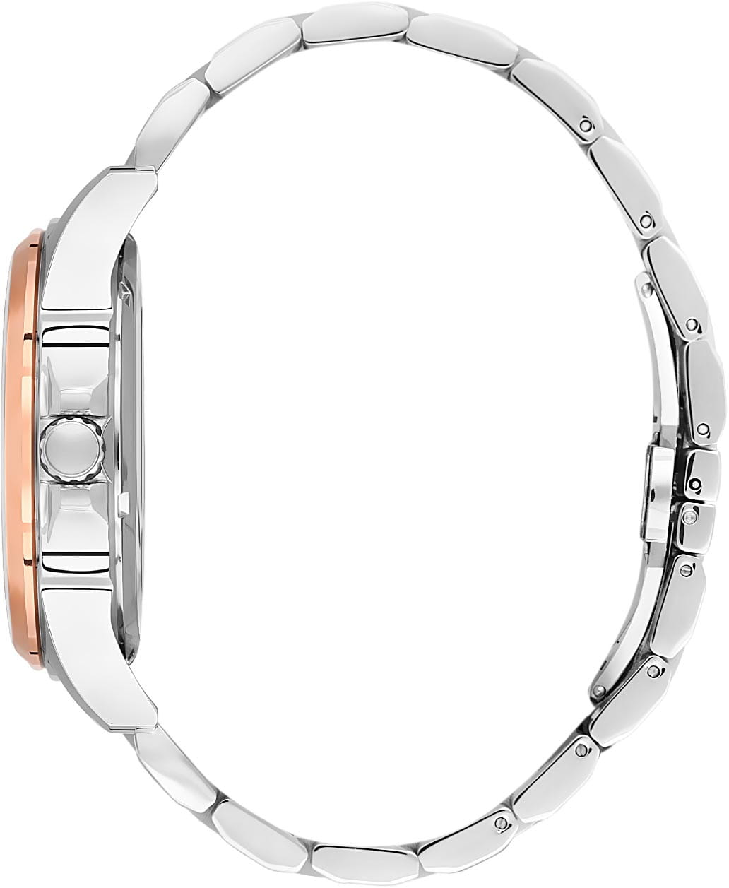 Мужские механические часы с автоподзаводом Santa Barbara Polo & Racquet Club — это стильный и технологичный аксессуар. Корпус диаметром 45 мм выполнен из стали. БезельБезельВнешний ободок, закрепляющий стекло. В спортивных часах так называется поворотное кольцо с делениями на циферблате, выполняет роль таймера – замеряет отрезки времени на шкале. Неподвижный безель – элемент декора. Однонаправленно вращающийся безель на дайверских часах позволяет фиксировать моменты погружения и выныривания на поверхность. с  IP-покрытиемIP-покрытиеМетод ионного напыления. Демонстрирует повышенную устойчивость к истиранию, окислению и химическим веществам. Под воздействием высокого давления и температуры около 1500°C молекулы металла надёжно соединяются с частицами корпуса часов. розового золота, с матовой и полированной отделкой. Циферблат серебристого цвета двухуровневый, частично прозрачный, украшен фирменным логотипом и накладными метками в виде штрихов. Часы оснащены индикацией второго часового пояса. Стрелки заострённые, прямоугольные, в стиле Baton, с люминесцентным покрытиемЛюминесцентное покрытиеПозволяет считывать показания времени в темноте. Производители наносят на стрелки, часовые индексы, безель или поверхность циферблата светонакопительный состав, дающий холодное свечение., обеспечивающим хорошую читаемость в темноте. Метки также имеют люминесцентное покрытие. Циферблат защищён минеральным стекломМинеральное стеклоМинеральное стекло представляет собой искусственно выращенный минерал кварца. Такое стекло отличается особой устойчивостью к повреждениям и царапинам. Уступает по некоторым качествам сапфировому стеклу.. Часы оснащены стальным браслетом с матовой и полированной отделкой и застёжкой «бабочка» с кнопкамиЗастёжка "бабочка"Такой вид застёжки дополняется предохранителями, помогающими избежать случайного раскрытия браслета. Обладают изящным исполнением. . Водонепроницаемость 50 м позволяет использовать часы в повседневных условиях. Идеальный выбор для тех, кто ценит современный дизайн, функциональность и качество.