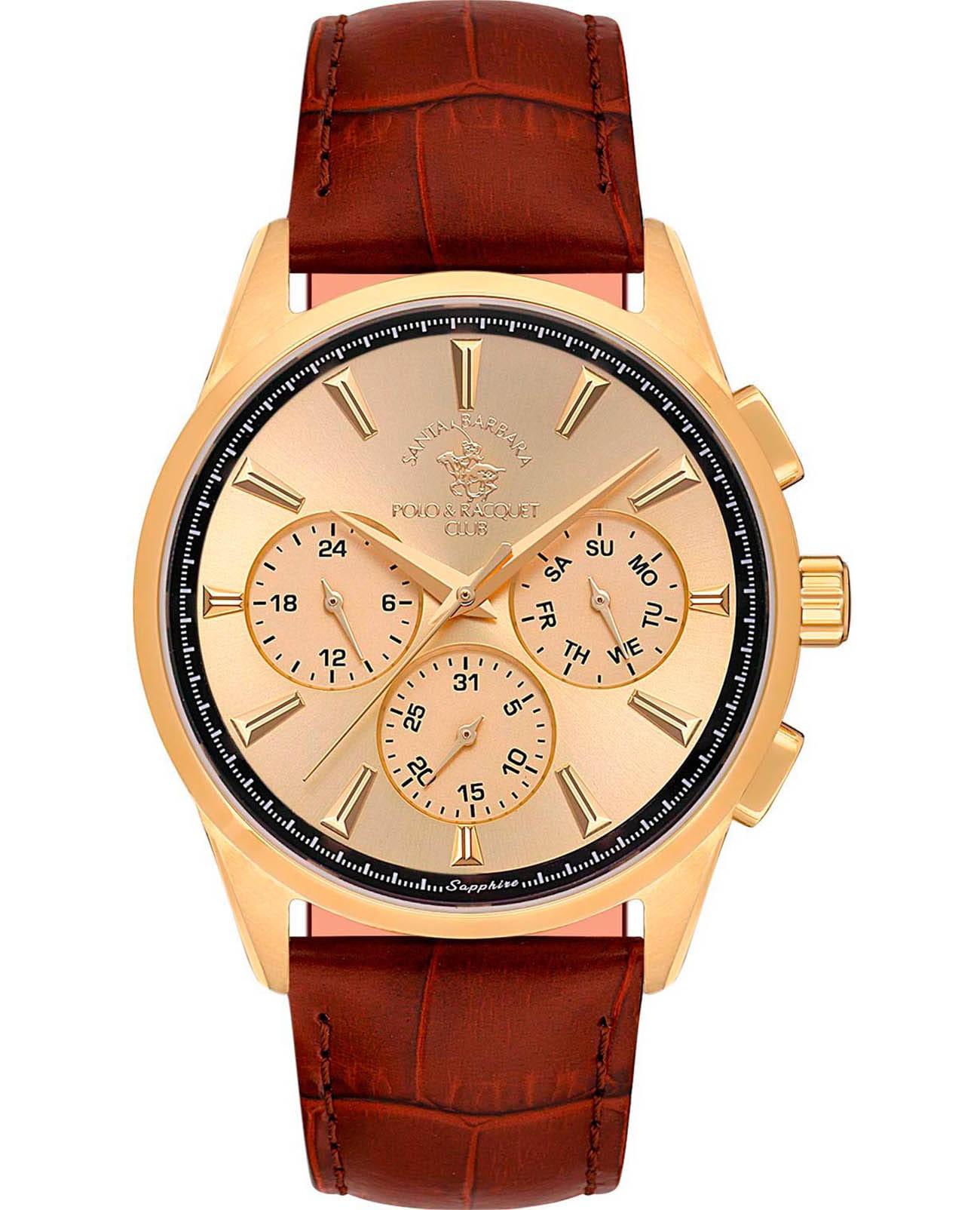 Мужские кварцевые часы Santa Barbara Polo & Racquet Club — это идеальный выбор для тех, кто ценит точность и практичность. Корпус диаметром 42 мм выполнен из нержавеющей стали 316L  с IP-покрытиемIP-покрытиеМетод ионного напыления. Демонстрирует повышенную устойчивость к истиранию, окислению и химическим веществам. Под воздействием высокого давления и температуры около 1500°C молекулы металла надёжно соединяются с частицами корпуса часов., с матовой и полированной отделкой. Циферблат золотого цвета оформлен по технологии Sunray («солнечные лучи»), дополнен накладными метками в виде штрихов и фирменным логотипом. Указатели дня недели и даты вынесены на отдельные субциферблаты, также присутствует индикация 24-часового формата времени. Стрелки клиновидной формы, в стиле Dauphine. Циферблат защищён минеральным стекломМинеральное стеклоМинеральное стекло представляет собой искусственно выращенный минерал кварца. Такое стекло отличается особой устойчивостью к повреждениям и царапинам. Уступает по некоторым качествам сапфировому стеклу.. Часы оснащены кожаным ремнём на стандартной застёжке. Водонепроницаемость 50 м позволяет использовать часы в повседневных условиях. Идеальный выбор для тех, кто ценит стиль, точность и надёжность.