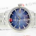 Глубокий синий циферблат с градиентом оформлен в текстуре «солнечные лучи» и дополняется серебристыми стрелками и индексами. Дата отображается в окне на позиции «3 часа».