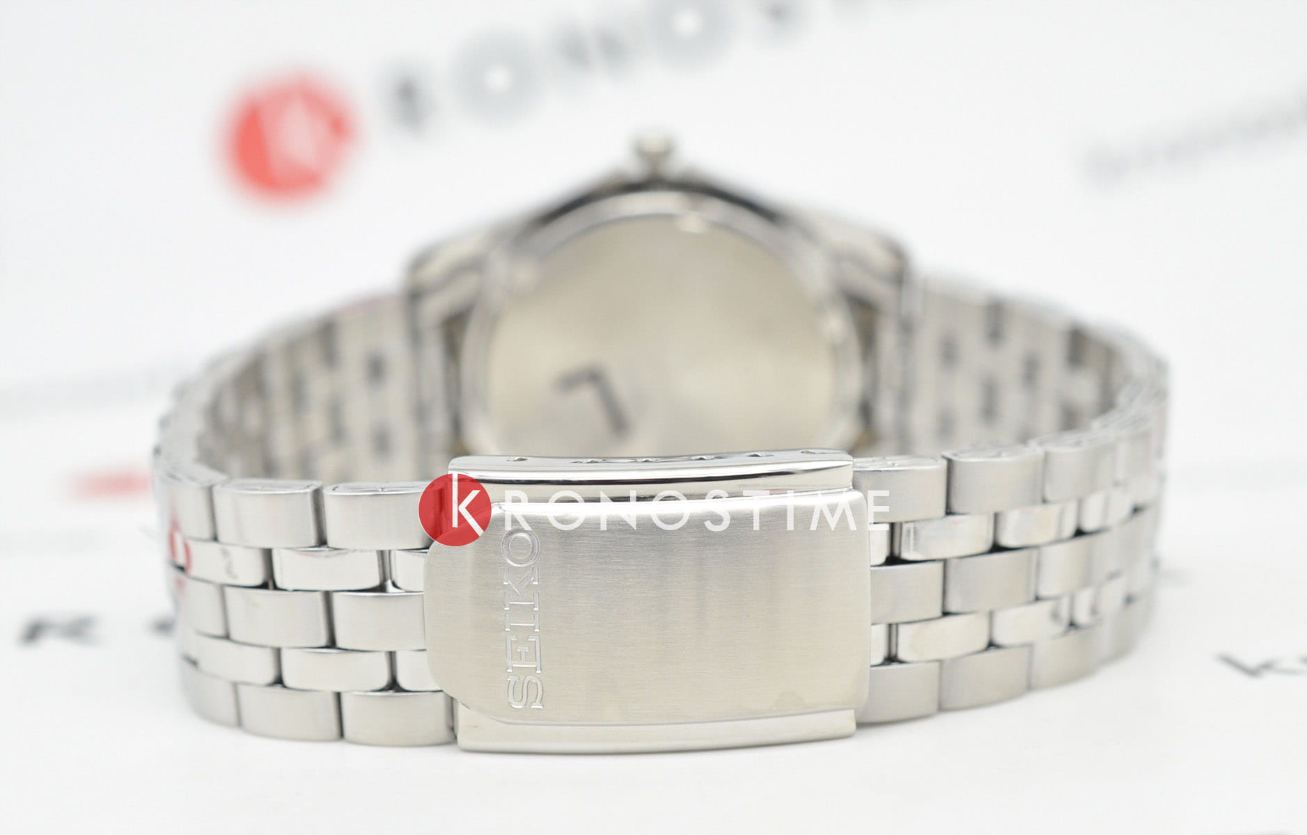 Мужские кварцевые часы Seiko — это элегантный аксессуар в классическом стиле. Корпус размером 38 мм и толщиной 8 мм выполнен из нержавеющей стали. Циферблат чёрного цвета оформлен индексами и стрелками. Указатели дня недели и даты вынесены на отдельные субциферблаты. Стрелки и метки с люминесцентным покрытиемЛюминесцентное покрытиеПозволяет считывать показания времени в темноте. Производители наносят на стрелки, часовые индексы, безель или поверхность циферблата светонакопительный состав, дающий холодное свечение., обеспечивающим хорошую читаемость в темноте. Циферблат защищён прочным защищён минеральным стекломМинеральное стеклоМинеральное стекло представляет собой искусственно выращенный минерал кварца. Такое стекло отличается особой устойчивостью к повреждениям и царапинам. Уступает по некоторым качествам сапфировому стеклу. от компании Seiko. Часы оснащены стальным браслетом с раскладной застёжкойРаскладная застёжкаТакой тип застёжки используется только на браслетах из металла. Она никогда не раскрывается полностью, происходит разделение на 2 и более частей. Раскладывающая застёжка снизит вероятность потери часов к минимуму.. Водонепроницаемость 30 м позволяет использовать часы в повседневных условиях. Идеальный выбор для тех, кто ценит японское качество и лаконичный дизайн.