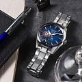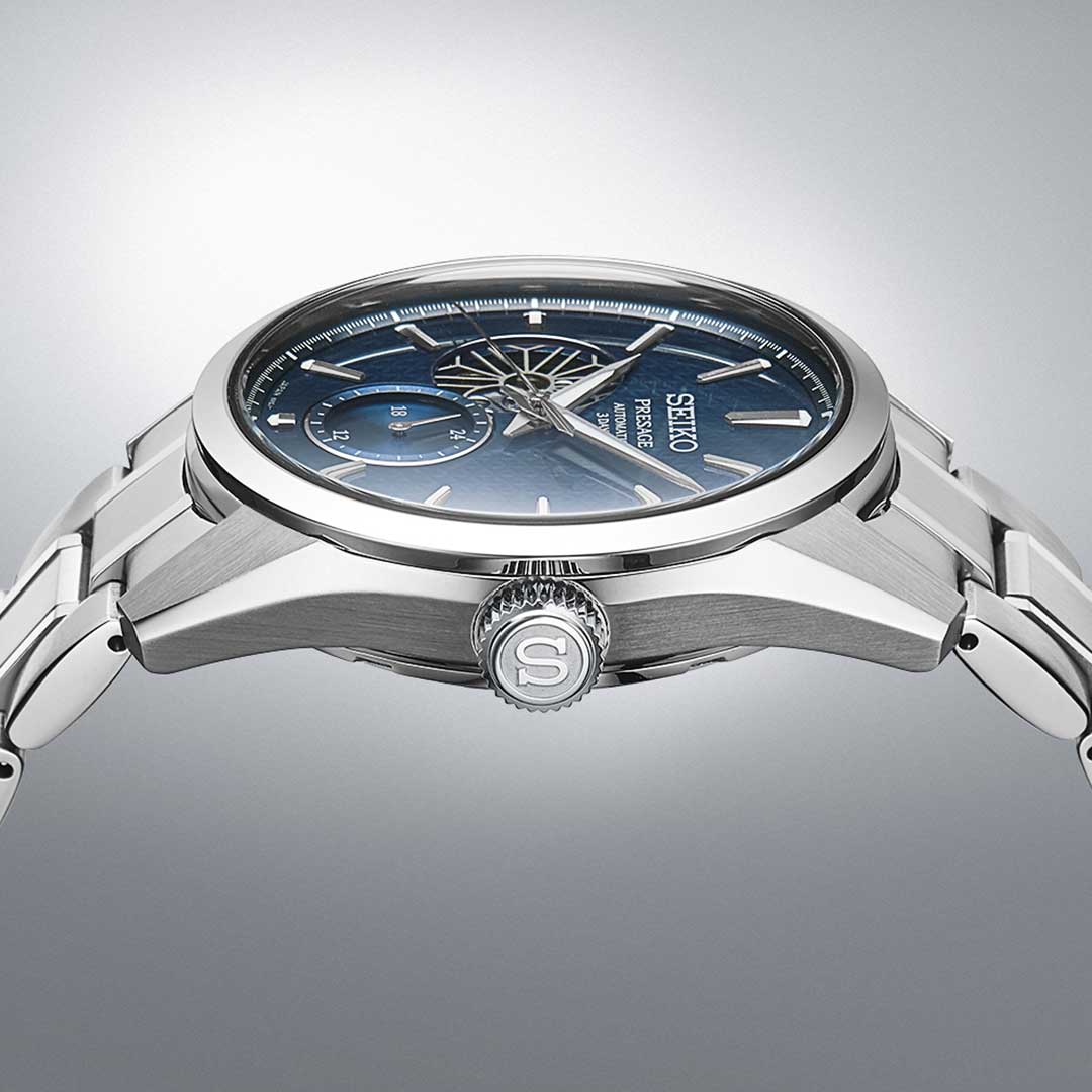 Элегантные механические часы Presage Sharp Edged продолжают серию, вдохновлённую богатым культурным наследием Японии. Их дизайн циферблата берёт мотивы из древнего узора «Асаноха», известного ещё с эпохи Хэйан и часто встречающегося в традиционных ремёслах. Эта коллекция сочетает в себе японское мастерство и современные технологии. Часы оснащены механическим калибром 6R5J с автоподзаводом и возможностью ручной подзаводки. Механизм работает на частоте 21 600 полуколебаний в час, имеет 24 драгоценных камня и обеспечивает внушительный запас хода — до 72 часов. Также реализована функция стоп-секунды для точной установки времени, а также защита от магнитных полей до 4800 А/м. Циферблат оформлен с использованием строгих штриховых меток, а через прозрачное окошко можно наблюдать за работой механизма. Часы поддерживают отображение времени в 12- и 24-часовом формате. Защиту циферблата обеспечивает сапфировое стеклоСапфировое стеклоПрочный и надёжный материал из кристалла сапфира синтетического происхождения, характеризующийся особой твёрдостью и устойчивостью к царапинам и повреждениям. выпуклой формы с антибликовым покрытием с обеих сторон, что делает его не только прочным, но и удобным для считывания информации при любом освещении. Задняя крышка выполнена завинчивающейся и прозрачной, что подчёркивает связь между внешним дизайном и внутренней технологией. Браслет изготовлен из нержавеющей стали и оснащён раскладной застёжкойРаскладная застёжкаТакой тип застёжки используется только на браслетах из металла. Она никогда не раскрывается полностью, происходит разделение на 2 и более частей. Раскладывающая застёжка снизит вероятность потери часов к минимуму., обеспечивающей надёжную фиксацию и комфорт при ношении. Часы обладают водонепроницаемостью до 100 метров, что позволяет использовать их не только в повседневной жизни, но и при плавании или занятиях водными видами спорта. Стрелки и метки дополнены люминесцентным покрытиемЛюминесцентное покрытиеПозволяет считывать показания времени в темноте. Производители наносят на стрелки, часовые индексы, безель или поверхность циферблата светонакопительный состав, дающий холодное свечение. LumiBrite, обеспечивающим отличную читаемость в условиях слабого освещения. Эти часы станут достойным аксессуаром для тех, кто ценит глубину дизайна, точность механизма и историю, воплощённую в каждом элементе.