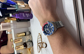 Модель имеет узнаваемую расцветку «Pepsi», оригинальный дизайн делает её запоминающейся деталью образа. Наручные часы с автоматической системой завода оснащены японским механизмом Seiko 4R36, имеющим 41-часовой резерв хода. Работа механизма прослеживается сквозь прозрачную заднюю крышку. Для изготовления корпуса и браслета использована хирургическая сталь 316L. Прочное минеральное стекло Hardlex устойчиво к царапинам. Задняя крышка завинчивается, закручивающаяся заводная головка оснащена системой защиты. Стрелки и метки имеют люминесцентное покрытиеЛюминесцентное покрытиеПозволяет считывать показания времени в темноте. Производители наносят на стрелки, часовые индексы, безель или поверхность циферблата светонакопительный состав, дающий холодное свечение.. БезельБезельВнешний ободок, закрепляющий стекло. В спортивных часах так называется поворотное кольцо с делениями на циферблате, выполняет роль таймера – замеряет отрезки времени на шкале. Неподвижный безель – элемент декора. Однонаправленно вращающийся безель на дайверских часах позволяет фиксировать моменты погружения и выныривания на поверхность. с PVD-покрытиемPVDУльтратонкое покрытие наносится в технике вакуумного напыления, сочетает в себе нитрид титана особой прочности со слоем золота или оксида хрома. Несёт в себе декоративную или защитную функцию.. Водостойкость 100 метров позволяет плавать в часах. Функции: отображение числа и дня недели, stop-second. Диаметр корпуса: 42,5 мм.