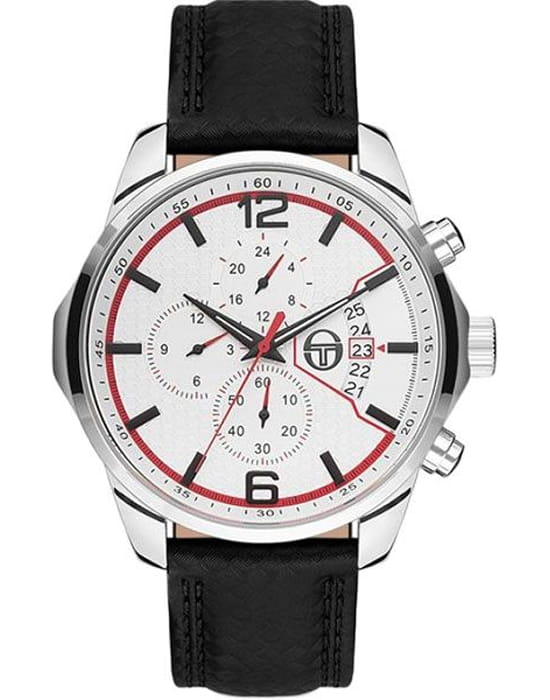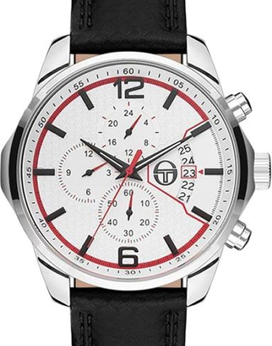 Sergio Tacchini ST.8.128.02 — мужские часы с выразительным спортивным стилем и функциональностью профессионального уровня. Корпус выполнен из нержавеющей стали, что обеспечивает прочность и благородный блеск. Белый циферблат с контрастными красными акцентами и чёрными метками придаёт модели динамичный характер, подчёркивая итальянский дух бренда. Встроенный хронографХронографФункция позволяет измерять отрезки времени с особой точностью: часы, минуты, секунды. Верным признаком хронографа является наличие на циферблате 3 дополнительных окошек-счётчиков. с тремя счётчиками позволяет измерять промежутки времени с высокой точностью, а апертура даты у отметки «3 часа» добавляет практичности. Поверхность циферблата защищена минеральным стекломМинеральное стеклоМинеральное стекло представляет собой искусственно выращенный минерал кварца. Такое стекло отличается особой устойчивостью к повреждениям и царапинам. Уступает по некоторым качествам сапфировому стеклу., устойчивым к царапинам, а надёжная стандартная застежка обеспечивает комфорт и безопасность при ношении. Водозащита 50 м подходит для ежедневного использования. Sergio Tacchini — это спортивная элегантность и точность, воплощённые в классическом итальянском дизайне.