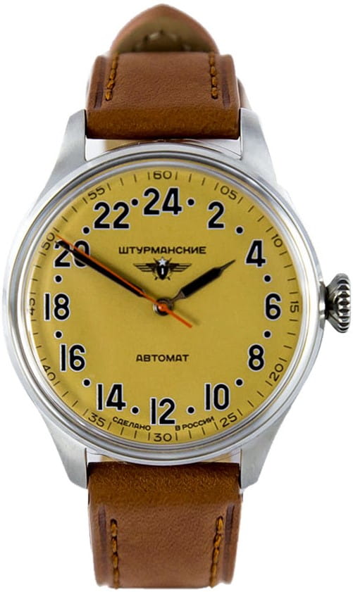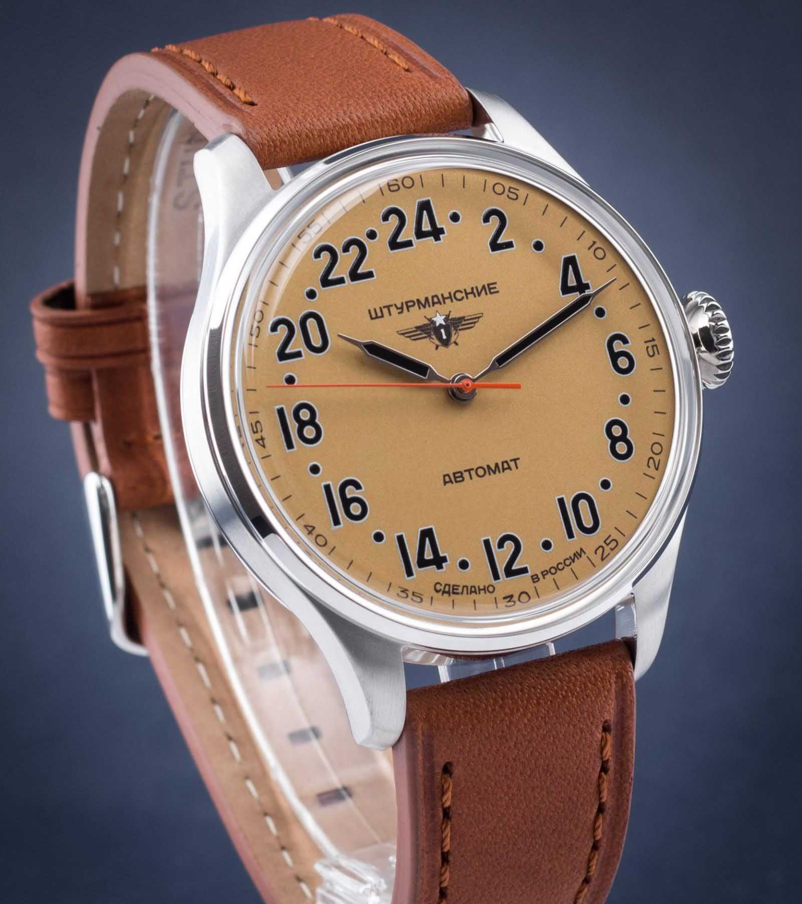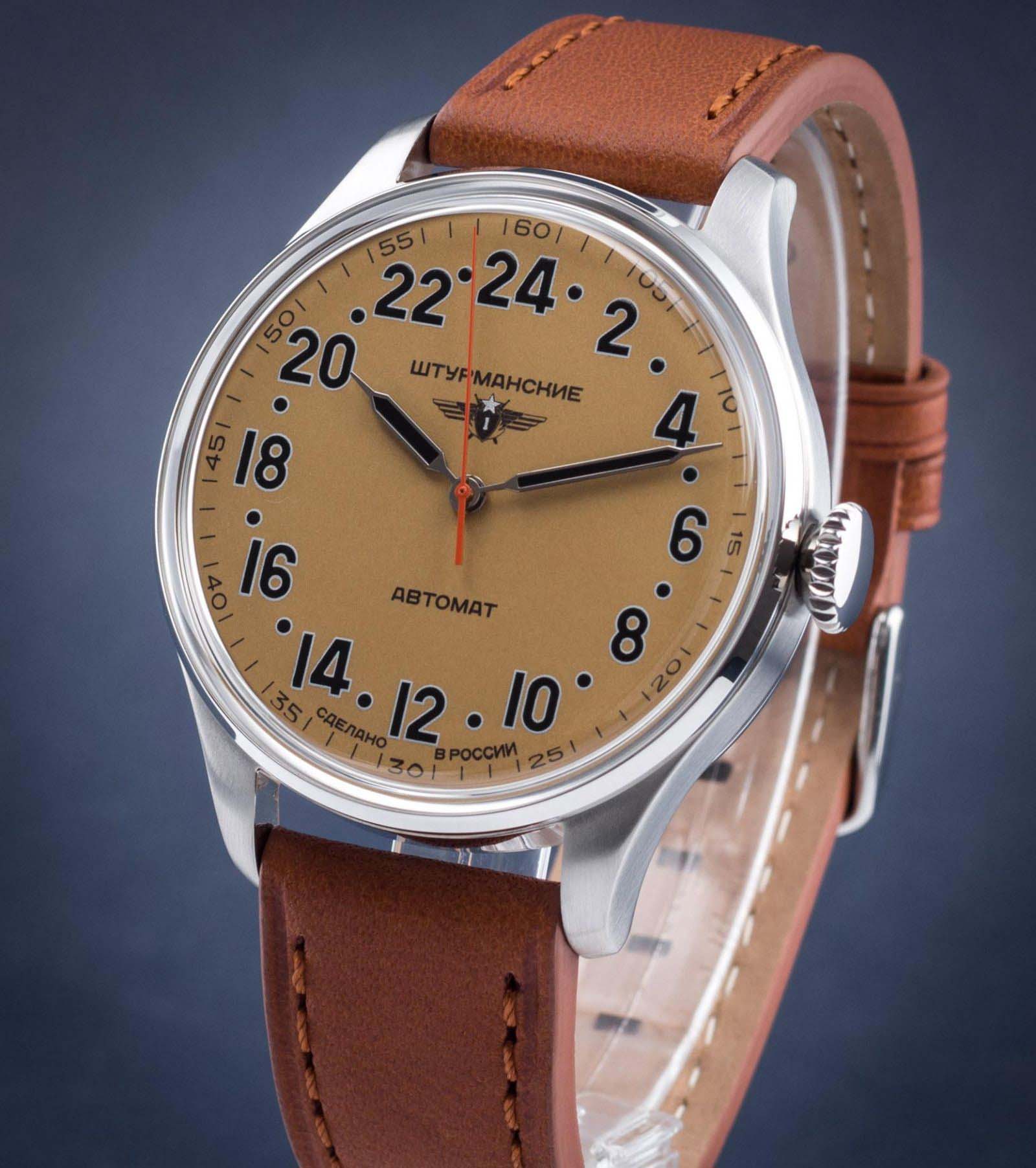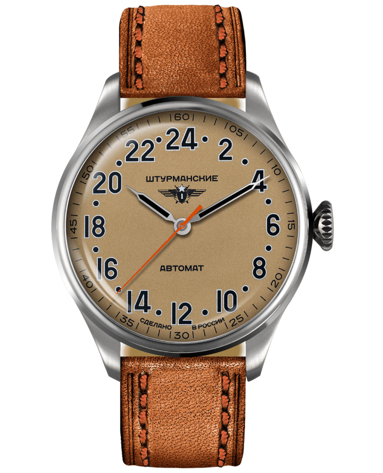 Штурманские мужские российские механические часы Штурманские Наследие Арктика 2431/6821344, механический механизм (автоматический калибр) с высокой точностью. Класс водозащиты: 30 метров, позволит защитить корпус от случайных брызг или капель дождя. Корпус часов изготовлен из стали. Кожаный ремешок на стандартной застёжке. В механизме 32 камня. Запас хода 31 час. Возможность ручного завода. 24-часовой формат отображения времени, часовая стрелка делает один оборот за сутки. Стрелки и метки с люминесцентным покрытиемЛюминесцентное покрытиеПозволяет считывать показания времени в темноте. Производители наносят на стрелки, часовые индексы, безель или поверхность циферблата светонакопительный состав, дающий холодное свечение..