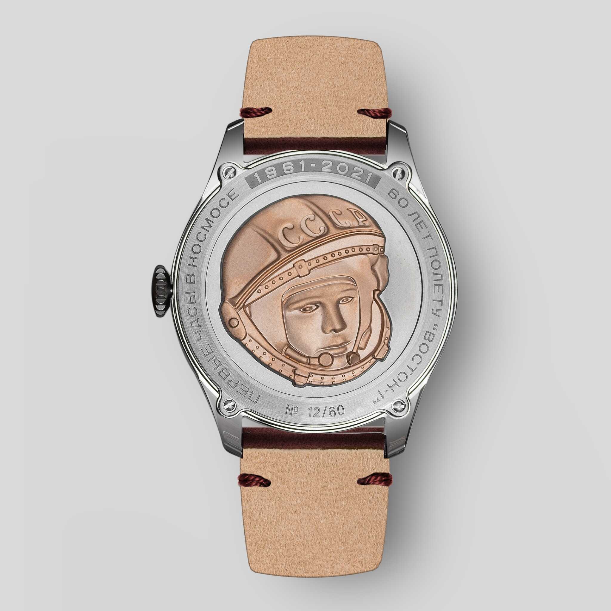 Мужские российские механические часы Штурманские Гагарин Наследие 2609/3787960, механический механизм (автоматический калибр) с высокой точностью. Сапфировое стеклоСапфировое стеклоПрочный и надёжный материал из кристалла сапфира синтетического происхождения, характеризующийся особой твёрдостью и устойчивостью к царапинам и повреждениям. устойчивое к мелким механическим повреждениям. Класс водозащиты: 50 метров, позволит защитить корпус от случайных брызг или капель дождя. Корпус часов изготовлен из титана. Кожаный ремешок на стандартной застёжке. Стрелки и метки с люминесцентным покрытиемЛюминесцентное покрытиеПозволяет считывать показания времени в темноте. Производители наносят на стрелки, часовые индексы, безель или поверхность циферблата светонакопительный состав, дающий холодное свечение.. Чёткая, читаемая минутная шкала уходит за приделы видимой области циферблата, подчёркивая изящность ободка корпуса. Оцифровка циферблата – отличительная особенность данной модели, её дизайн не изменился с самой первый, гагаринской серии. Заводная головка конической формы с удобной насечкой повторяет дизайн оригинальной модели. Лимитированная серия: 60 шт.