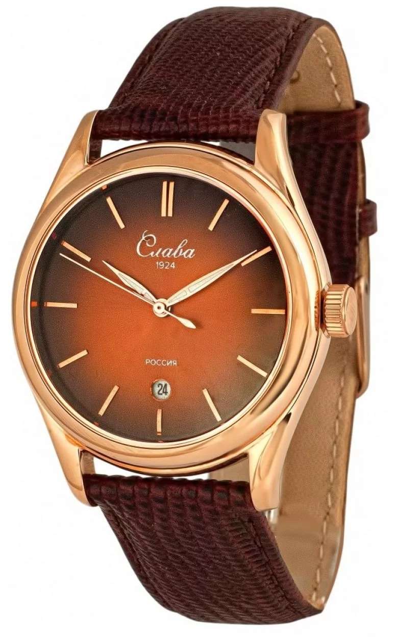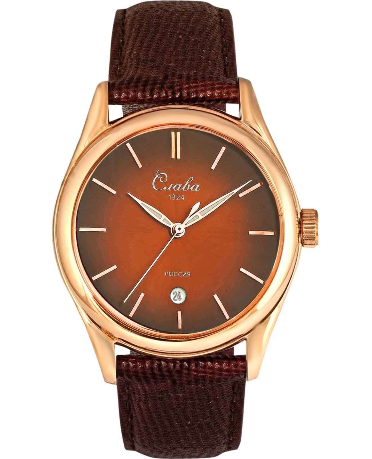 Российские наручные часы Слава Сенат 2493525/300-2115 станут отличным дополнением к вашему образу и идеальным выбором для тех, кто ценит стиль, комфорт и надежность. Эти часы оснащены японским кварцевым механизмом Miyota 2115, что гарантирует их точность и долговечность. Корпус часов диаметром 38 мм и толщиной 11 мм выполнен из прочной стали с золотистым IP-покрытиемIP-покрытиеМетод ионного напыления. Демонстрирует повышенную устойчивость к истиранию, окислению и химическим веществам. Под воздействием высокого давления и температуры около 1500°C молекулы металла надёжно соединяются с частицами корпуса часов., а коричневый циферблат с эффектом "солнечные лучи" изящными метками защищен сапфировым стекломСапфировое стеклоПрочный и надёжный материал из кристалла сапфира синтетического происхождения, характеризующийся особой твёрдостью и устойчивостью к царапинам и повреждениям., устойчивым к царапинам. Окошко календаря, расположенное в положении 6 часов, добавляет функциональности и удобства в повседневном использовании. Стрелки с люминесцентным покрытиемЛюминесцентное покрытиеПозволяет считывать показания времени в темноте. Производители наносят на стрелки, часовые индексы, безель или поверхность циферблата светонакопительный состав, дающий холодное свечение., что облегчает чтение времени даже в условиях слабого освещения. Эти часы обладают водозащитой 50WR, что позволяет не переживать за их сохранность в условиях повышенной влажности. Завершает образ кожаный ремешок с классической застежкой, обеспечивающий комфортную посадку на запястье.
