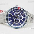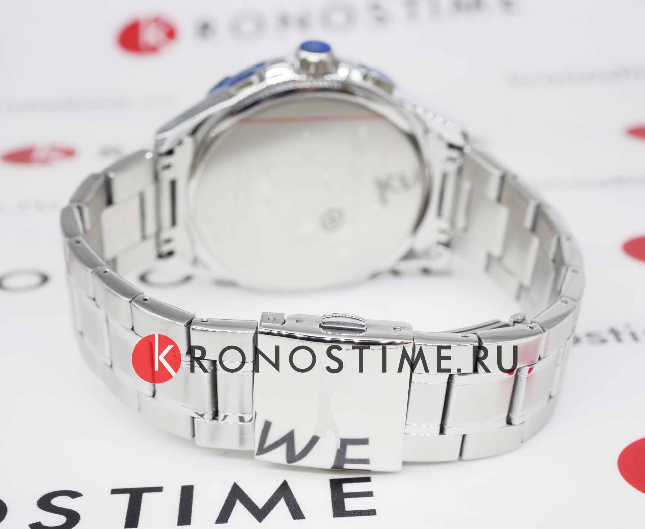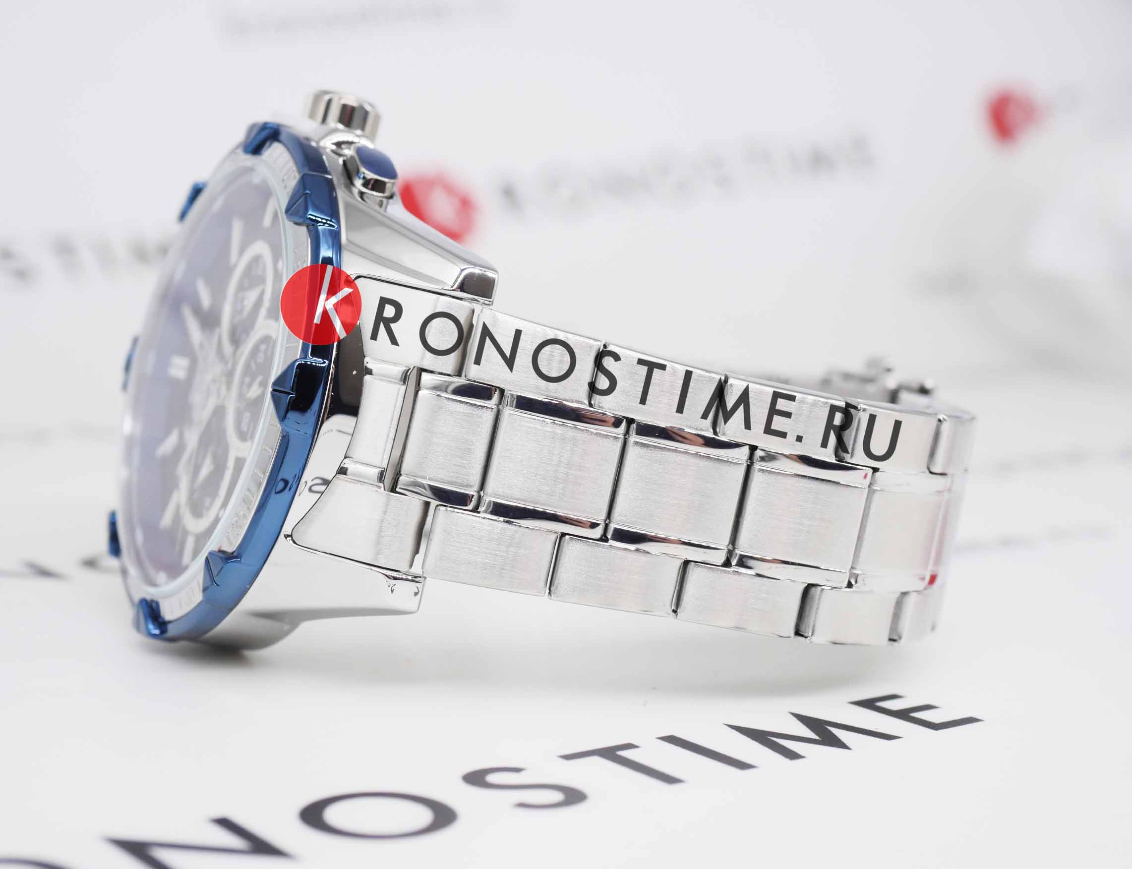 Циферблат синего цвета декорирован стрелками, обеспечивающими четкую читаемость времени. Для защиты используется минеральное стеклоМинеральное стеклоМинеральное стекло представляет собой искусственно выращенный минерал кварца. Такое стекло отличается особой устойчивостью к повреждениям и царапинам. Уступает по некоторым качествам сапфировому стеклу., обеспечивающее прочную защиту от царапин.