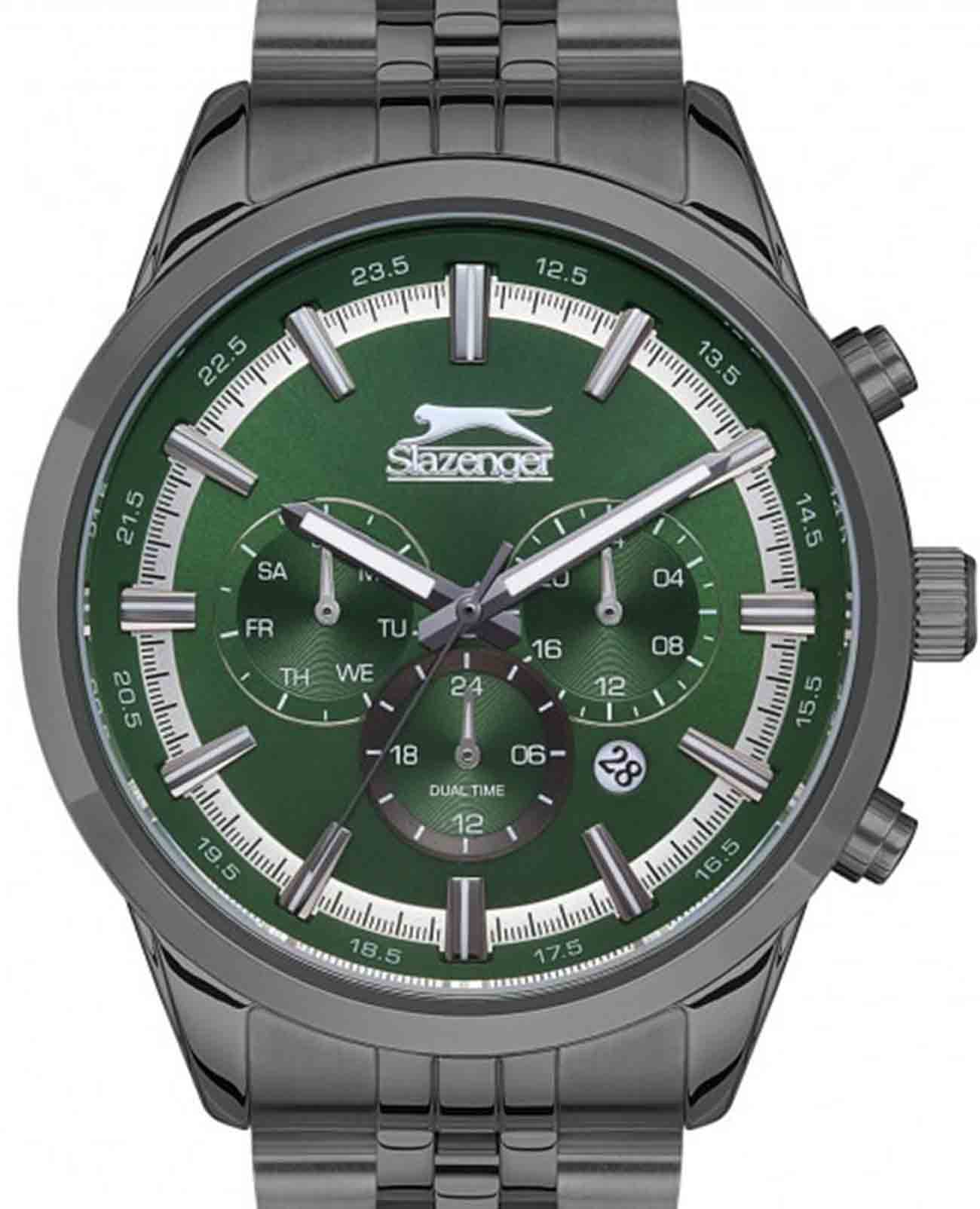 Часы Slazenger SL.09.2131.2.04 воплощают в себе элегантность и практичность, идеально подходящие для современных мужчин. Их зеленый циферблат, защищенный минеральным стекломМинеральное стеклоМинеральное стекло представляет собой искусственно выращенный минерал кварца. Такое стекло отличается особой устойчивостью к повреждениям и царапинам. Уступает по некоторым качествам сапфировому стеклу., заключен в черный матовый корпус диаметром 46 мм, который изготовлен из прочного суперметалла с IP-покрытиемIP-покрытиеМетод ионного напыления. Демонстрирует повышенную устойчивость к истиранию, окислению и химическим веществам. Под воздействием высокого давления и температуры около 1500°C молекулы металла надёжно соединяются с частицами корпуса часов.. Часы оснащены двойным форматом времени (12 и 24 часа), вторым часовым поясом и удобным окошком даты. Надежный кварцевый механизм обеспечивает точность, а водозащита 5 ATM делает их устойчивыми к воздействию воды. Стальной браслет из суперметалла с черным IP-покрытиемIP-покрытиеМетод ионного напыления. Демонстрирует повышенную устойчивость к истиранию, окислению и химическим веществам. Под воздействием высокого давления и температуры около 1500°C молекулы металла надёжно соединяются с частицами корпуса часов. имеет раскладную застёжкуРаскладная застёжкаТакой тип застёжки используется только на браслетах из металла. Она никогда не раскрывается полностью, происходит разделение на 2 и более частей. Раскладывающая застёжка снизит вероятность потери часов к минимуму., что подчеркивает современный стиль и позволяет легко снимать часы. Часы оснащены 24-часовым указателем времени, а также функциями отображения даты и дня недели. Люминесцентное покрытиеЛюминесцентное покрытиеПозволяет считывать показания времени в темноте. Производители наносят на стрелки, часовые индексы, безель или поверхность циферблата светонакопительный состав, дающий холодное свечение. на стрелках и метках обеспечивает отличную видимость в темноте.