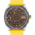 Часы Slazenger SL.09.2211.1.03 представляют собой идеальное сочетание стильного дизайна и высокой функциональности, что делает их отличным выбором для современного мужчины. Оснащенные кварцевым механизмом, они гарантируют точность и надежность в течение долгого времени. Корпус часов выполнен из суперметалла с серым IP-покрытиемIP-покрытиеМетод ионного напыления. Демонстрирует повышенную устойчивость к истиранию, окислению и химическим веществам. Под воздействием высокого давления и температуры около 1500°C молекулы металла надёжно соединяются с частицами корпуса часов., что обеспечивает не только привлекательный внешний вид, но и повышенную прочность, превосходящую многие другие сплавы. Коричневый циферблат с разноуровневым дизайном и метками в виде точек украшен логотипом бренда, добавляя изысканности и элегантности. Часы обладают водозащитой уровня 50WR, что позволяет им выдерживать случайные контакты с водой, такие как дождь или брызги. Минеральное стеклоМинеральное стеклоМинеральное стекло представляет собой искусственно выращенный минерал кварца. Такое стекло отличается особой устойчивостью к повреждениям и царапинам. Уступает по некоторым качествам сапфировому стеклу. надежно защищает циферблат от царапин, сохраняя его безупречный вид. Габариты аксессуара включают диаметр корпуса 49 мм и толщину 13 мм, что делает его заметным и солидным на запястье. Вес часов составляет 112 г, а ширина желтого силиконового ремешка варьируется от 26 мм до 22 мм, обеспечивая комфорт и удобство при ношении. Классическая застежка ремешка гарантирует надежную фиксацию на руке, а рифленая заводная головка добавляет функциональности и стиля. 24-часовой формат времени делает эти часы практичным и полезным аксессуаром для повседневной жизни.