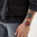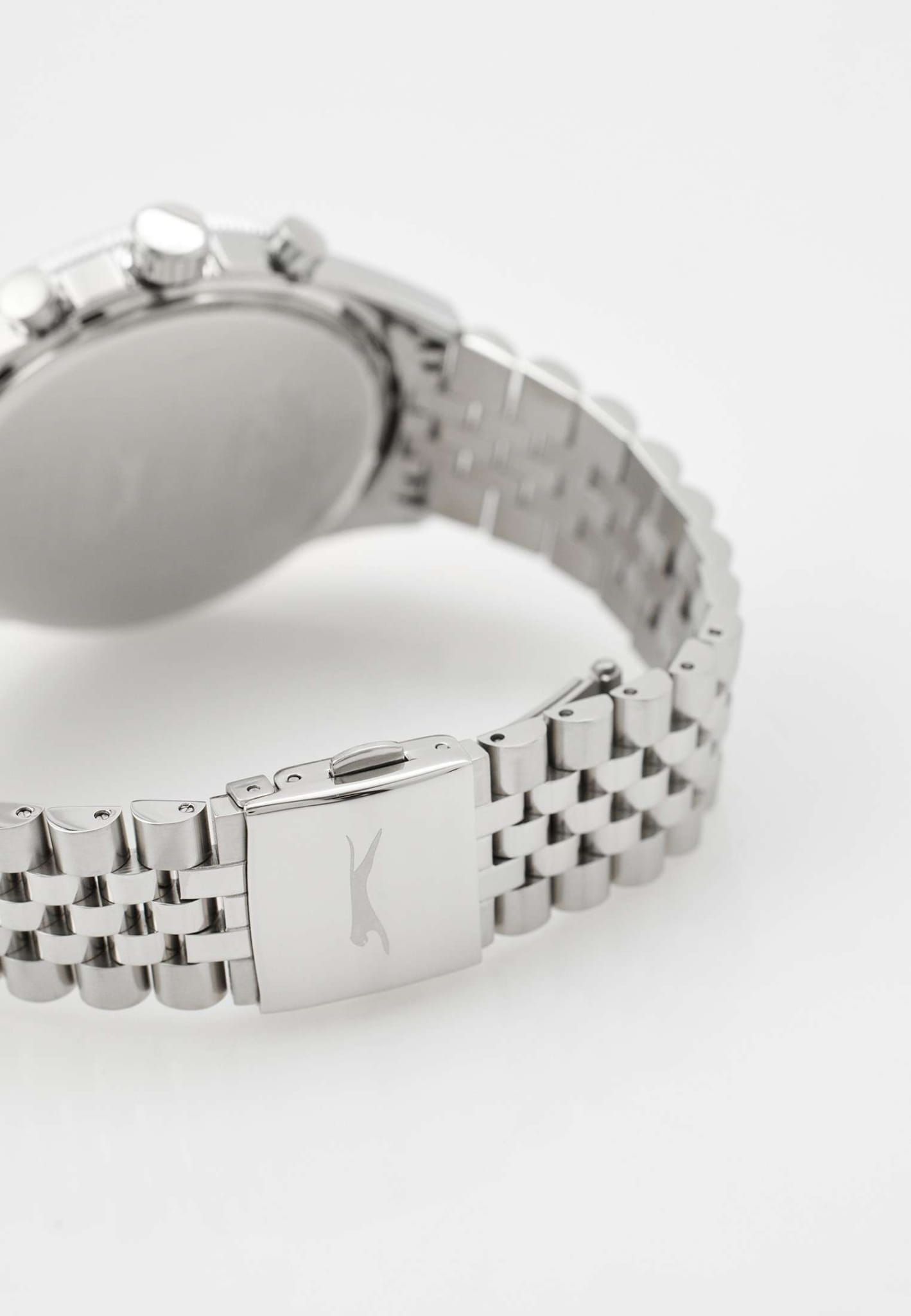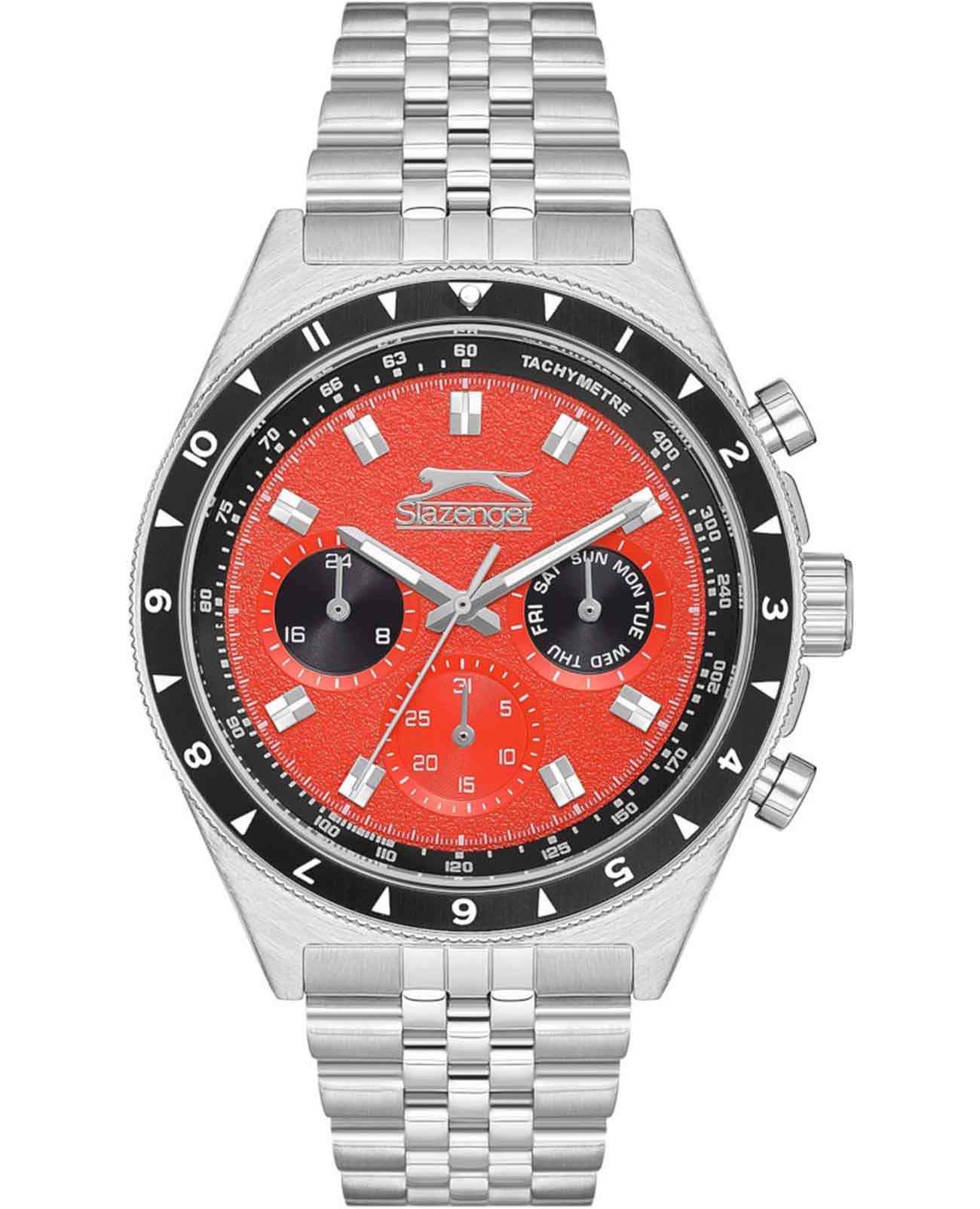 Часы Slazenger SL.09.2248.2.05 — это современная модель с выразительным спортивным характером, идеально подходящая для активного образа жизни. Корпус выполнен из прочного металла, красный циферблат защищён минеральным стекломМинеральное стеклоМинеральное стекло представляет собой искусственно выращенный минерал кварца. Такое стекло отличается особой устойчивостью к повреждениям и царапинам. Уступает по некоторым качествам сапфировому стеклу., устойчивым к царапинам. Часы также оснащены шкалой тахиметраТахиметрРазмеченная шкала, располагается на ободке или безеле часов. Тахиметр позволяет рассчитать скорость на определённом участке пути, расстояние измеряется в километрах или милях., что добавляет им функциональности и может быть полезно для измерения скорости.  На безельБезельВнешний ободок, закрепляющий стекло. В спортивных часах так называется поворотное кольцо с делениями на циферблате, выполняет роль таймера – замеряет отрезки времени на шкале. Неподвижный безель – элемент декора. Однонаправленно вращающийся безель на дайверских часах позволяет фиксировать моменты погружения и выныривания на поверхность. нанесено черное IP-покрытиеIP-покрытиеМетод ионного напыления. Демонстрирует повышенную устойчивость к истиранию, окислению и химическим веществам. Под воздействием высокого давления и температуры около 1500°C молекулы металла надёжно соединяются с частицами корпуса часов..  Диаметр корпуса составляет 46 мм, толщина — 11 мм, а ширина браслета — 22 мм.  Часы оснащены металлическим браслетом с надежной раскладной застёжкойРаскладная застёжкаТакой тип застёжки используется только на браслетах из металла. Она никогда не раскрывается полностью, происходит разделение на 2 и более частей. Раскладывающая застёжка снизит вероятность потери часов к минимуму., благодаря чему часы удобно сидят на руке и не вызывают дискомфорта даже при длительном ношении. Вес модели составляет 130 грамм. Надёжный кварцевый механизм обеспечивает точность времени, а уровень водозащиты WR 50 позволяет использовать часы в повседневных условиях, не опасаясь случайных брызг или дождя. Для удобства использования в темное время суток предусмотрено люминесцентное покрытиеЛюминесцентное покрытиеПозволяет считывать показания времени в темноте. Производители наносят на стрелки, часовые индексы, безель или поверхность циферблата светонакопительный состав, дающий холодное свечение. стрелок и меток. Дополнительные малые циферблаты показывают дату, день недели и текущее время в 24-часовом формате, что делает использование часов ещё более удобным и функциональным.