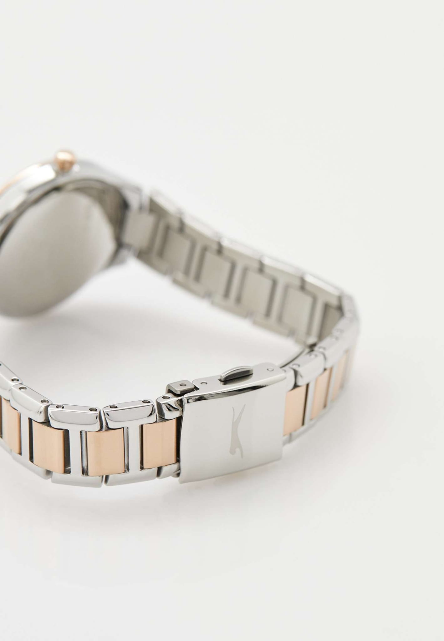 Часы Slazenger SL.09.2254.3.05 — это стильный и надежный аксессуар, который подчеркнет ваш индивидуальный образ. Корпус и браслет выполнены из инновационного суперметалла — сплава на основе меди с пониженным содержанием цинка и никеля, обладающего особой прочностью и долговечностью благодаря специальной технологии покрытия, а на безельБезельВнешний ободок, закрепляющий стекло. В спортивных часах так называется поворотное кольцо с делениями на циферблате, выполняет роль таймера – замеряет отрезки времени на шкале. Неподвижный безель – элемент декора. Однонаправленно вращающийся безель на дайверских часах позволяет фиксировать моменты погружения и выныривания на поверхность. нанесено розово-золотистое IP-покрытиеIP-покрытиеМетод ионного напыления. Демонстрирует повышенную устойчивость к истиранию, окислению и химическим веществам. Под воздействием высокого давления и температуры около 1500°C молекулы металла надёжно соединяются с частицами корпуса часов.. Модель оснащена точным кварцевым механизмом, который обеспечивает стабильную работу и не требует ежедневного завода. Под прочным минеральным стекломМинеральное стеклоМинеральное стекло представляет собой искусственно выращенный минерал кварца. Такое стекло отличается особой устойчивостью к повреждениям и царапинам. Уступает по некоторым качествам сапфировому стеклу. расположен лаконичный белый циферблат, придающий часам элегантный и современный вид. Стальной браслет с частичным розово-золотистым IP-покрытиемIP-покрытиеМетод ионного напыления. Демонстрирует повышенную устойчивость к истиранию, окислению и химическим веществам. Под воздействием высокого давления и температуры около 1500°C молекулы металла надёжно соединяются с частицами корпуса часов. с раскладной застёжкойРаскладная застёжкаТакой тип застёжки используется только на браслетах из металла. Она никогда не раскрывается полностью, происходит разделение на 2 и более частей. Раскладывающая застёжка снизит вероятность потери часов к минимуму. обеспечивает комфортную посадку. Диаметр корпуса составляет 32 мм, толщина — 8 мм, что делает часы аккуратными и удобными для повседневного ношения. Класс водозащиты 3 атмосферы защищает механизм от случайных брызг и капель дождя.
