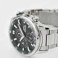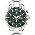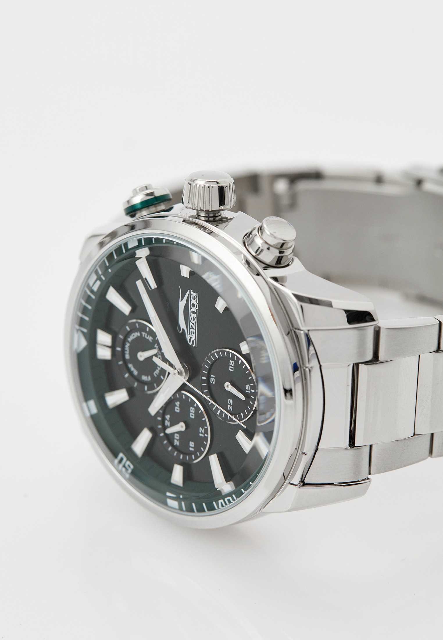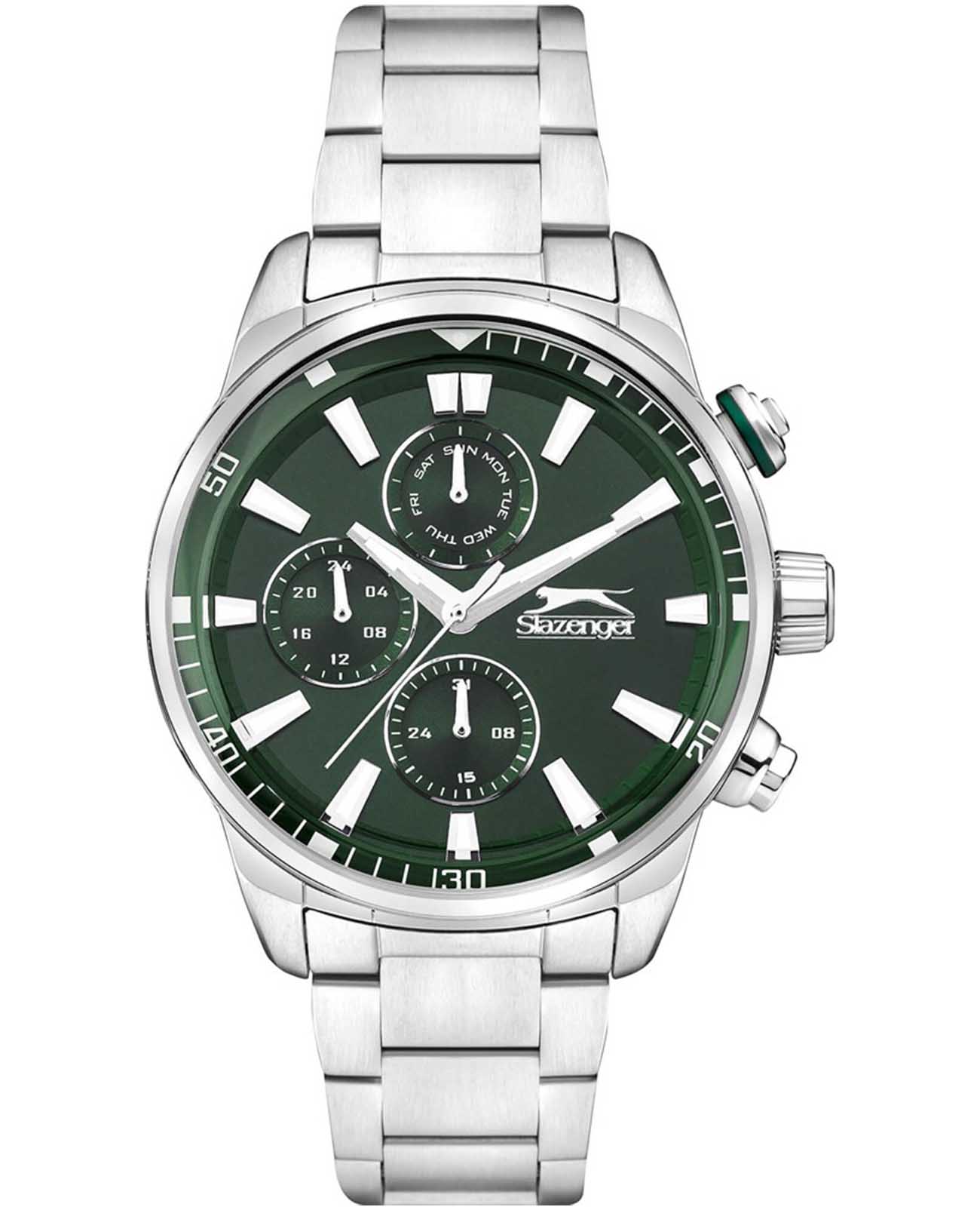 Часы Slazenger SL.09.2272.2.07 – это стильный аксессуар, сочетающий в себе современный дизайн и продуманную функциональность. Модель оснащена точным кварцевым механизмом, который гарантирует стабильную работу и легкость в использовании. Корпус и браслет выполнены из суперметалла — инновационного сплава на основе меди с пониженным содержанием цинка и никеля, обладающего высокой прочностью и устойчивостью к износу благодаря особой технологии покрытия. Элегантный зеленый циферблат защищён надёжным минеральным стекломМинеральное стеклоМинеральное стекло представляет собой искусственно выращенный минерал кварца. Такое стекло отличается особой устойчивостью к повреждениям и царапинам. Уступает по некоторым качествам сапфировому стеклу., устойчивым к царапинам и повреждениям. На циферблате размещены отдельные индикаторы: 24-часовой указатель времени, а также дополнительные циферблаты для отображения даты и дня недели, что делает модель максимально информативной и удобной в повседневном использовании. Водозащита 5 АТМ (5 бар) надёжно защищает механизм от брызг и дождя, а диаметр корпуса 45 мм и толщина 13 мм обеспечивают солидный внешний вид и комфортную посадку на запястье. Стальной браслет с раскладной застёжкойРаскладная застёжкаТакой тип застёжки используется только на браслетах из металла. Она никогда не раскрывается полностью, происходит разделение на 2 и более частей. Раскладывающая застёжка снизит вероятность потери часов к минимуму. обеспечивает комфортную посадку. Стрелки с люминесцентным покрытиемЛюминесцентное покрытиеПозволяет считывать показания времени в темноте. Производители наносят на стрелки, часовые индексы, безель или поверхность циферблата светонакопительный состав, дающий холодное свечение. удобно подсвечиваются в темноте после зарядки на свету.  Часы подойдут как для ежедневного ношения, так и для особых случаев, а универсальный дизайн подчеркнёт индивидуальность и вкус владельца.
