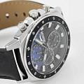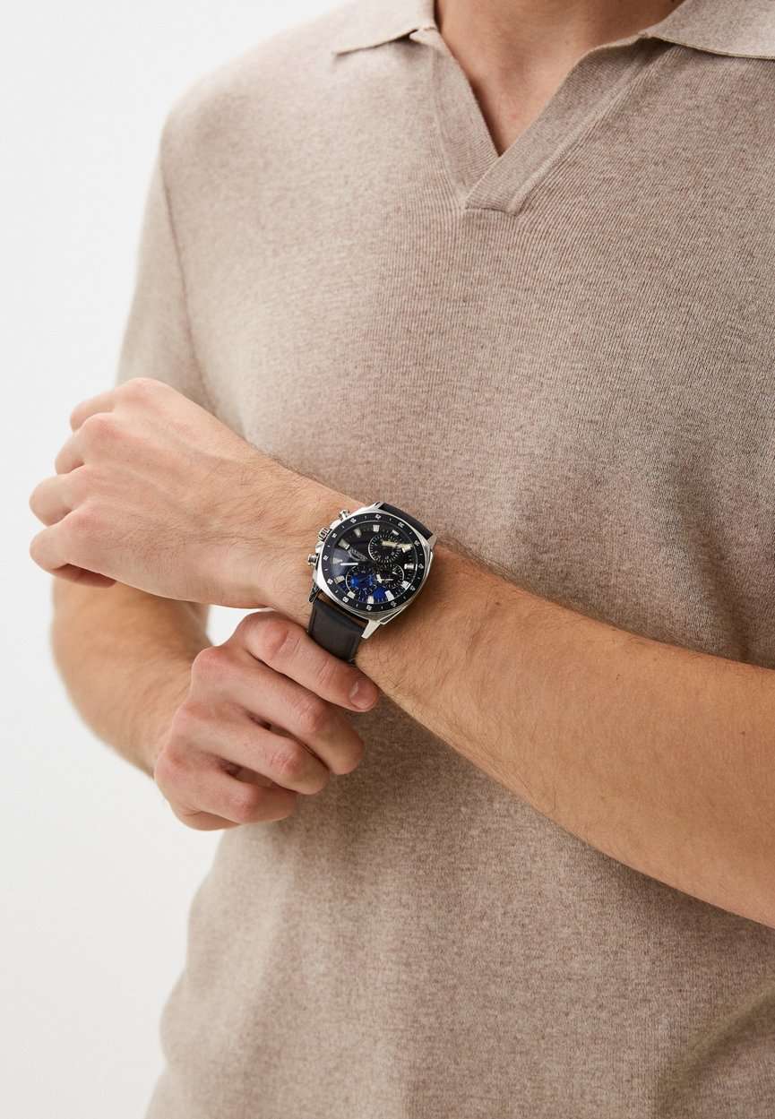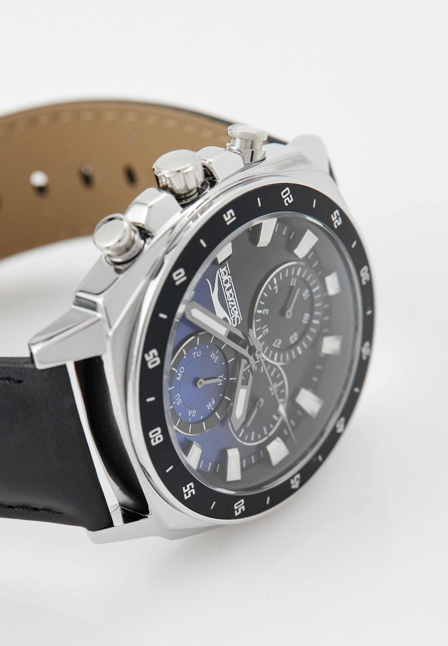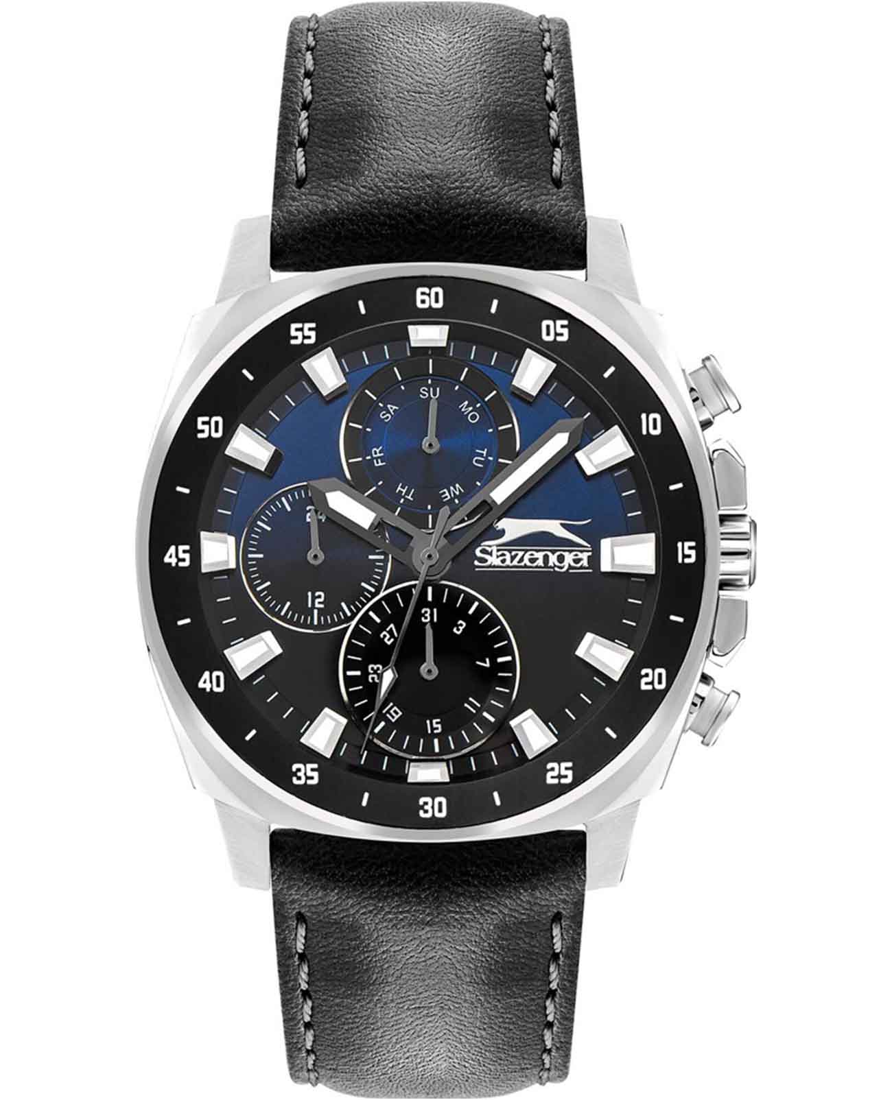 Slazenger SL.09.2293.2.01 — это стильные наручные часы, выполненные в современном дизайне и отлично подходящие для повседневного использования. Корпус диаметром 45 мм изготовлен из прочного металла и дополнен минеральным стекломМинеральное стеклоМинеральное стекло представляет собой искусственно выращенный минерал кварца. Такое стекло отличается особой устойчивостью к повреждениям и царапинам. Уступает по некоторым качествам сапфировому стеклу., которое защищает сине-черный циферблат. Черный кожаный ремешок шириной 24 мм оснащён надежной классической застежкой, которая обеспечивает комфортную посадку на руке. Кварцевый механизм гарантирует точный ход, а водозащита уровня WR 50 позволяет не снимать часы во время мытья рук или под дождём. Модель оснащена люминесцентным покрытиемЛюминесцентное покрытиеПозволяет считывать показания времени в темноте. Производители наносят на стрелки, часовые индексы, безель или поверхность циферблата светонакопительный состав, дающий холодное свечение. стрелок и меток, что облегчает считывание времени в темноте. Дополнительные малые циферблаты отображают дату, день недели и текущее время в 24-часовом формате. Часы также оснащены заводной головкой с защитой и безелемБезельВнешний ободок, закрепляющий стекло. В спортивных часах так называется поворотное кольцо с делениями на циферблате, выполняет роль таймера – замеряет отрезки времени на шкале. Неподвижный безель – элемент декора. Однонаправленно вращающийся безель на дайверских часах позволяет фиксировать моменты погружения и выныривания на поверхность. с черным IP-покрытиемIP-покрытиеМетод ионного напыления. Демонстрирует повышенную устойчивость к истиранию, окислению и химическим веществам. Под воздействием высокого давления и температуры около 1500°C молекулы металла надёжно соединяются с частицами корпуса часов. и секундной разметкой. Вес изделия составляет 80 грамм.