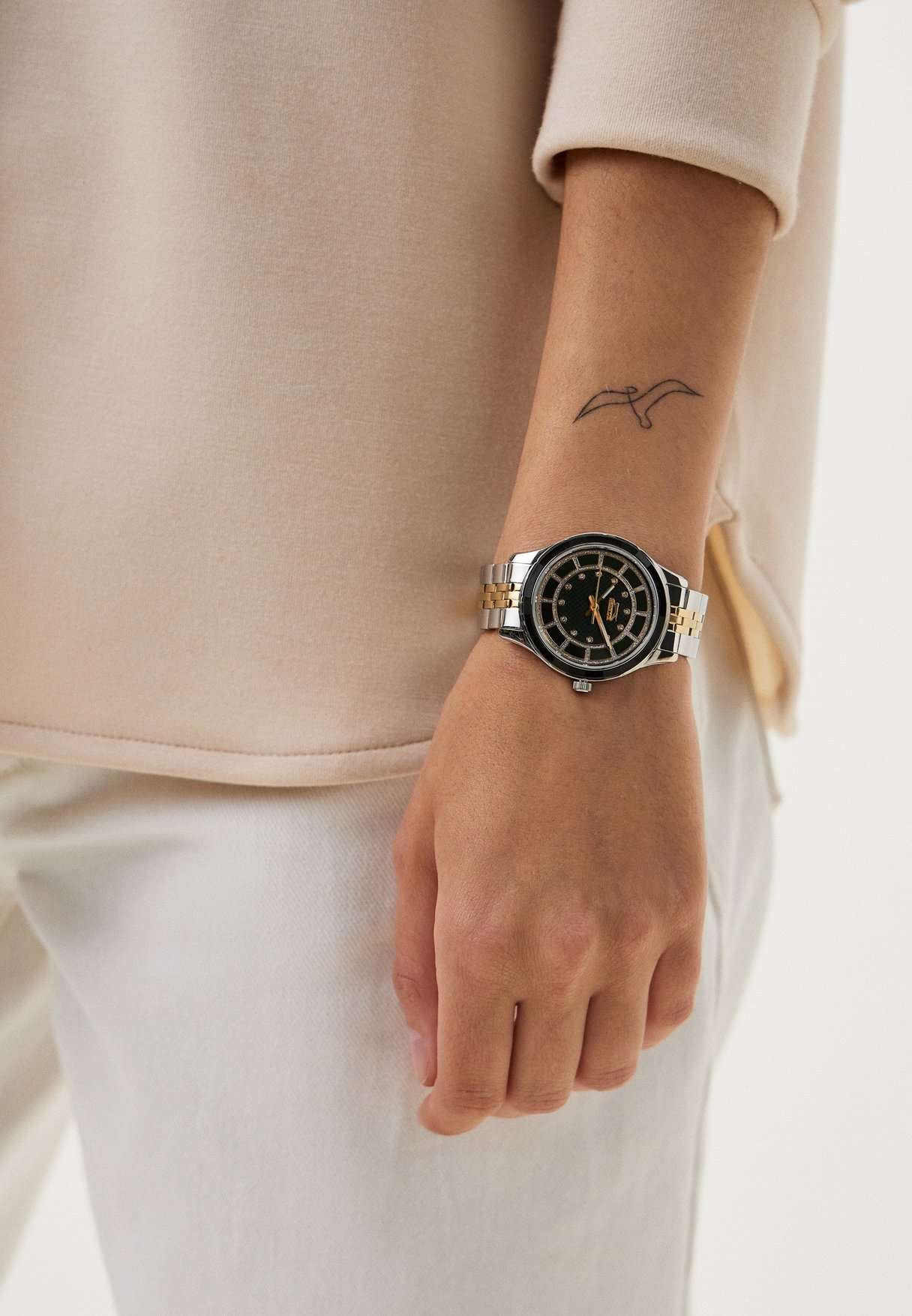 Женские наручные часы Slazenger SL.09.2295.3.02 — это элегантный аксессуар, который подчеркнет утончённый стиль своей обладательницы. Корпус диаметром 36 мм и толщиной 11,5 мм выполнен из прочного металла и надёжно защищён минеральным стекломМинеральное стеклоМинеральное стекло представляет собой искусственно выращенный минерал кварца. Такое стекло отличается особой устойчивостью к повреждениям и царапинам. Уступает по некоторым качествам сапфировому стеклу., устойчивым к царапинам. Зеленый циферблат украшен изящными кристаллами, придающими часам особый блеск и изысканность. Модель оснащена люминесцентным покрытиемЛюминесцентное покрытиеПозволяет считывать показания времени в темноте. Производители наносят на стрелки, часовые индексы, безель или поверхность циферблата светонакопительный состав, дающий холодное свечение. стрелок, что облегчает считывание времени в темноте. Особое внимание привлекает безельБезельВнешний ободок, закрепляющий стекло. В спортивных часах так называется поворотное кольцо с делениями на циферблате, выполняет роль таймера – замеряет отрезки времени на шкале. Неподвижный безель – элемент декора. Однонаправленно вращающийся безель на дайверских часах позволяет фиксировать моменты погружения и выныривания на поверхность. с черным IP-покрытиемIP-покрытиеМетод ионного напыления. Демонстрирует повышенную устойчивость к истиранию, окислению и химическим веществам. Под воздействием высокого давления и температуры около 1500°C молекулы металла надёжно соединяются с частицами корпуса часов.. Металлический браслет с частичным золотистым IP-покрытиемIP-покрытиеМетод ионного напыления. Демонстрирует повышенную устойчивость к истиранию, окислению и химическим веществам. Под воздействием высокого давления и температуры около 1500°C молекулы металла надёжно соединяются с частицами корпуса часов. шириной 16 мм оснащён удобной раскладной застёжкойРаскладная застёжкаТакой тип застёжки используется только на браслетах из металла. Она никогда не раскрывается полностью, происходит разделение на 2 и более частей. Раскладывающая застёжка снизит вероятность потери часов к минимуму. для комфортной посадки на запястье. Кварцевый механизм обеспечивает точность хода, а водозащита уровня WR 30 защищает часы от случайных брызг. Для удобства в условиях плохой освещённости предусмотрена подсветка стрелок. Вес изделия составляет 95 граммов.