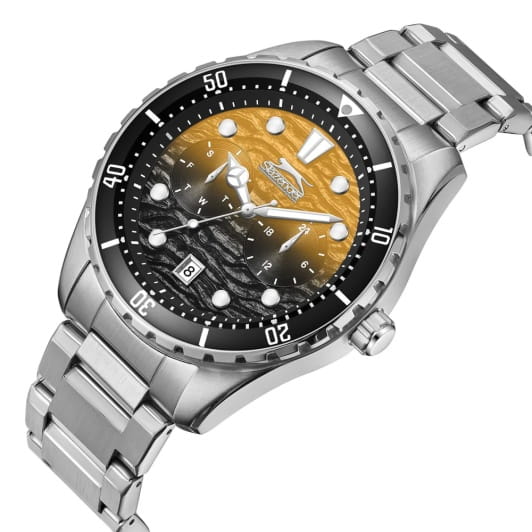 Мужские кварцевые часы Slazenger SL.09.2366.2.05 – идеальное сочетание классического дизайна и современных технологий, созданное для уверенных в себе мужчин. Корпус выполнен из нержавеющей стали серебристого цвета, диаметром 44 мм и толщиной 12 мм, подчёркивает надежность модели и делает их идеальным аксессуаром для любой ситуации – будь то деловая встреча или повседневные выходы. Циферблат надёжно защищён минеральным стекломМинеральное стеклоМинеральное стекло представляет собой искусственно выращенный минерал кварца. Такое стекло отличается особой устойчивостью к повреждениям и царапинам. Уступает по некоторым качествам сапфировому стеклу., которое устойчиво к механическим повреждениям и сохраняет кристальную прозрачность. Поворотный безельБезельВнешний ободок, закрепляющий стекло. В спортивных часах так называется поворотное кольцо с делениями на циферблате, выполняет роль таймера – замеряет отрезки времени на шкале. Неподвижный безель – элемент декора. Однонаправленно вращающийся безель на дайверских часах позволяет фиксировать моменты погружения и выныривания на поверхность. с IP-покрытиемIP-покрытиеМетод ионного напыления. Демонстрирует повышенную устойчивость к истиранию, окислению и химическим веществам. Под воздействием высокого давления и температуры около 1500°C молекулы металла надёжно соединяются с частицами корпуса часов.. Стальной браслет удобно облегает запястье и фиксируется с помощью раскладной застёжкиРаскладная застёжкаТакой тип застёжки используется только на браслетах из металла. Она никогда не раскрывается полностью, происходит разделение на 2 и более частей. Раскладывающая застёжка снизит вероятность потери часов к минимуму., обеспечивая надёжность и комфорт в повседневном ношении. Стрелки и метки покрыты люминесцентным покрытиемЛюминесцентное покрытиеПозволяет считывать показания времени в темноте. Производители наносят на стрелки, часовые индексы, безель или поверхность циферблата светонакопительный состав, дающий холодное свечение., обеспечивающим отличную читаемость в темноте. Эти часы станут не просто аксессуаром, а надежным спутником в любой ситуации, подчеркивая ваш безупречный вкус и деловой стиль. Окошко даты находится в положении 6 часов. Вынесенный циферблат с 24-х часовым указателем времени. Водозащита до 100 метров позволит плавать, нырять и заниматься другими водными видами спорта. Функция второго часового поясаВторой часовой поясФункция, позволяющая отображать время двух часовых поясов одновременно..