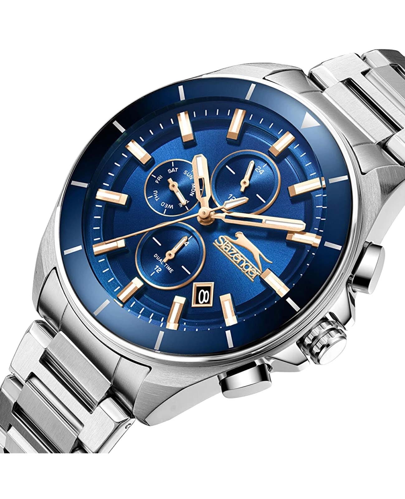 Мужские кварцевые часы Slazenger - это выразительный и функциональный аксессуар. Корпус диаметром 44 мм и толщиной 13 мм выполнен из нержавеющей стали 316L. Циферблат синего цвета оформлен индексами и стрелками. Циферблат защищён минеральным стекломМинеральное стеклоМинеральное стекло представляет собой искусственно выращенный минерал кварца. Такое стекло отличается особой устойчивостью к повреждениям и царапинам. Уступает по некоторым качествам сапфировому стеклу.. Механизм — кварцевый калибр JP1500Y. Часы оснащены индикацией дня недели, даты, 12/24-часового формата времени и функцией второго часового пояса (GMT)Второй часовой поясФункция, позволяющая отображать время двух часовых поясов одновременно.. Окошко даты расположено в положении 6 часов. Часы оснащены стальным браслетом с раскладной застёжкойРаскладная застёжкаТакой тип застёжки используется только на браслетах из металла. Она никогда не раскрывается полностью, происходит разделение на 2 и более частей. Раскладывающая застёжка снизит вероятность потери часов к минимуму.. Водонепроницаемость 100 м позволяет использовать часы для плавания и повседневного ношения. Гарантия — 12 месяцев. Идеальный выбор для тех, кто ценит стиль, функциональность и качество.
