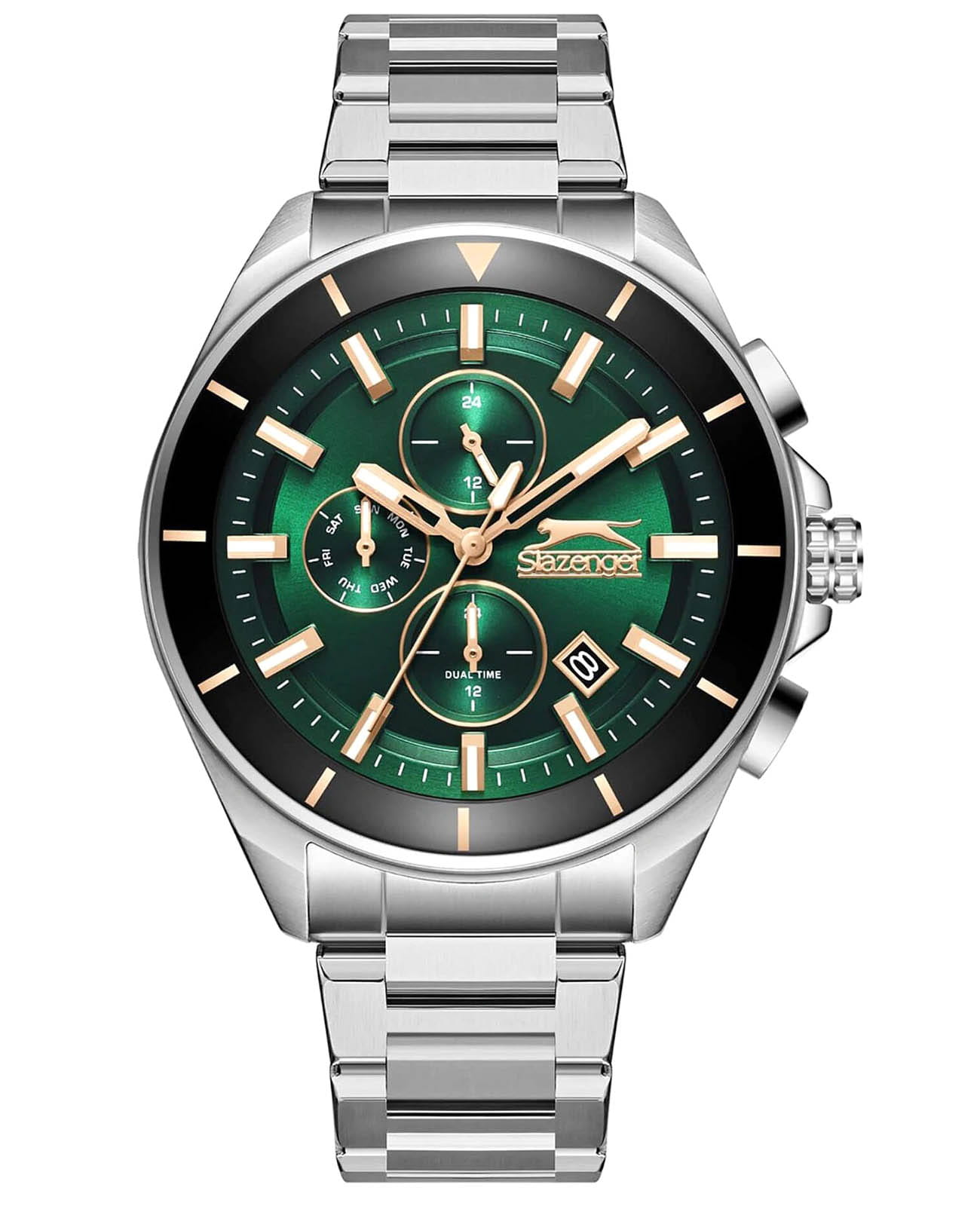 Часы Slazenger SL.09.2393.2.08 представляют собой стильное и функциональное дополнение к вашему образу. Их зелёный циферблат и корпус с безелемБезельВнешний ободок, закрепляющий стекло. В спортивных часах так называется поворотное кольцо с делениями на циферблате, выполняет роль таймера – замеряет отрезки времени на шкале. Неподвижный безель – элемент декора. Однонаправленно вращающийся безель на дайверских часах позволяет фиксировать моменты погружения и выныривания на поверхность. из нержавеющей стали с IP-покрытиемIP-покрытиеМетод ионного напыления. Демонстрирует повышенную устойчивость к истиранию, окислению и химическим веществам. Под воздействием высокого давления и температуры около 1500°C молекулы металла надёжно соединяются с частицами корпуса часов. создают элегантный и современный вид, который подчеркнет вашу индивидуальность. Эти мужские часы оснащены кварцевым механизмом, обеспечивающим точность хода. Минеральное стеклоМинеральное стеклоМинеральное стекло представляет собой искусственно выращенный минерал кварца. Такое стекло отличается особой устойчивостью к повреждениям и царапинам. Уступает по некоторым качествам сапфировому стеклу. защищает циферблат от царапин, а люминесцентное покрытиеЛюминесцентное покрытиеПозволяет считывать показания времени в темноте. Производители наносят на стрелки, часовые индексы, безель или поверхность циферблата светонакопительный состав, дающий холодное свечение. на стрелках и метках позволяют легко считывать время даже в темноте. Функциональность часов дополнена 24-часовым указателем времени, календарем даты и дня недели. Стальной браслет с раскладной застёжкойРаскладная застёжкаТакой тип застёжки используется только на браслетах из металла. Она никогда не раскрывается полностью, происходит разделение на 2 и более частей. Раскладывающая застёжка снизит вероятность потери часов к минимуму. гармонично дополняет общий дизайн. Размер корпуса составляет 44 мм в диаметре и 13 мм в толщину, что делает их удобными для повседневного ношения. А водозащита уровня 100 ATM делает их надежными спутниками даже в условиях повышенной влажности.