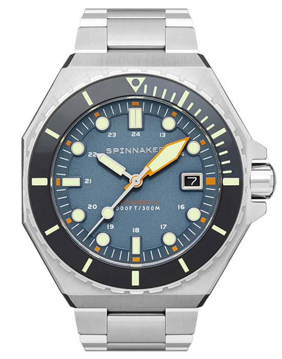 Мужские итальянские часы Spinnaker Dumas SP-5081-DD, механический механизм (автоматический калибр) с высокой точностью. Циферблат с люминесцентным покрытиемЛюминесцентное покрытиеПозволяет считывать показания времени в темноте. Производители наносят на стрелки, часовые индексы, безель или поверхность циферблата светонакопительный состав, дающий холодное свечение. стрелок и меток, дополнен сапфировым стекломСапфировое стеклоПрочный и надёжный материал из кристалла сапфира синтетического происхождения, характеризующийся особой твёрдостью и устойчивостью к царапинам и повреждениям., устойчивым к появлению царапин и обладающее высокой прозрачностью. Класс водозащиты: 300 метров, позволит плавать, нырять и заниматься другими водными видами спорта. Корпус часов изготовлен из стали.