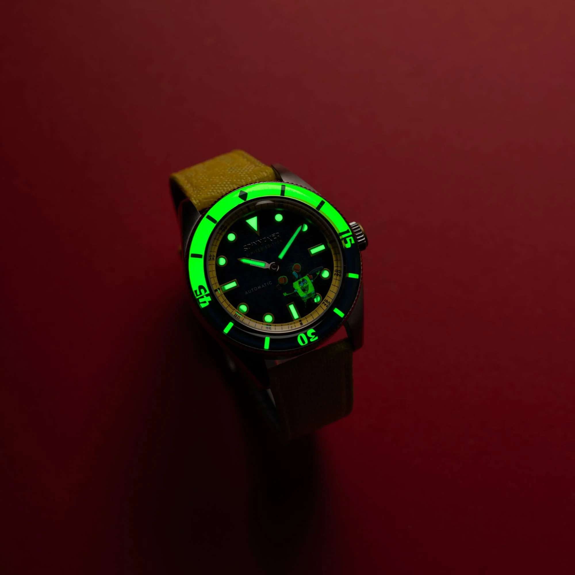 Мужские механические часы с автоподзаводом Spinnaker — это стильный и функциональный аксессуар. Корпус диаметром 43 мм и толщиной 13 мм выполнен из нержавеющей стали. БезельБезельВнешний ободок, закрепляющий стекло. В спортивных часах так называется поворотное кольцо с делениями на циферблате, выполняет роль таймера – замеряет отрезки времени на шкале. Неподвижный безель – элемент декора. Однонаправленно вращающийся безель на дайверских часах позволяет фиксировать моменты погружения и выныривания на поверхность. с IP-покрытиемIP-покрытиеМетод ионного напыления. Демонстрирует повышенную устойчивость к истиранию, окислению и химическим веществам. Под воздействием высокого давления и температуры около 1500°C молекулы металла надёжно соединяются с частицами корпуса часов.. Циферблат синего цвета оформлен штрихами, точками и стрелками. Присутствует малая секундная стрелка. Стрелки и метки с люминесцентным покрытиемЛюминесцентное покрытиеПозволяет считывать показания времени в темноте. Производители наносят на стрелки, часовые индексы, безель или поверхность циферблата светонакопительный состав, дающий холодное свечение. Super-LumiNova, обеспечивающим хорошую читаемость в темноте. Циферблат защищён сапфировым стекломСапфировое стеклоПрочный и надёжный материал из кристалла сапфира синтетического происхождения, характеризующийся особой твёрдостью и устойчивостью к царапинам и повреждениям. с антибликовым покрытиемАнтибликовое покрытиеСлой оксида металла в 0,13-0,3 микрон, благодаря которому стекло часов не бликует и не отражает свет. Антибликовое покрытие уменьшает отражение света в 10 раз, обеспечивая отличную читаемость показателей циферблата.. Завинчивающаяся заводная головка повышает водонепроницаемость. Часы оснащены жёлтым нейлоновым ремешком на стандартной пряжке. Водонепроницаемость 150 м позволяет использовать часы для плавания. Идеальный выбор для тех, кто ценит качество и нестандартный дизайн.