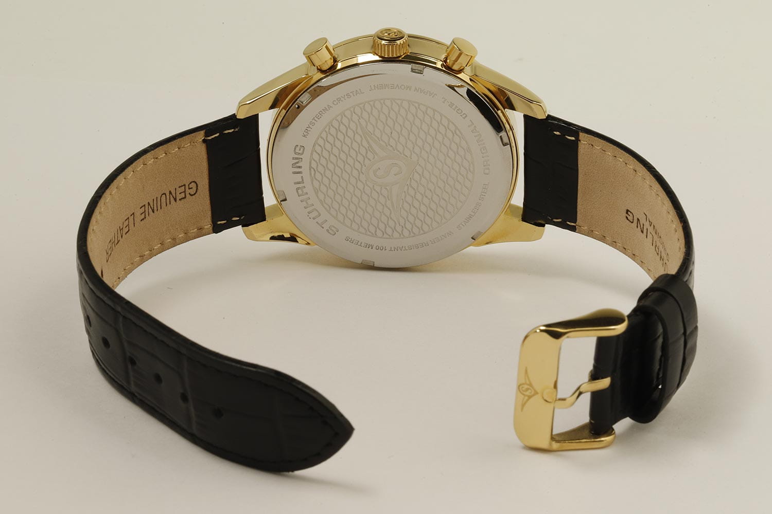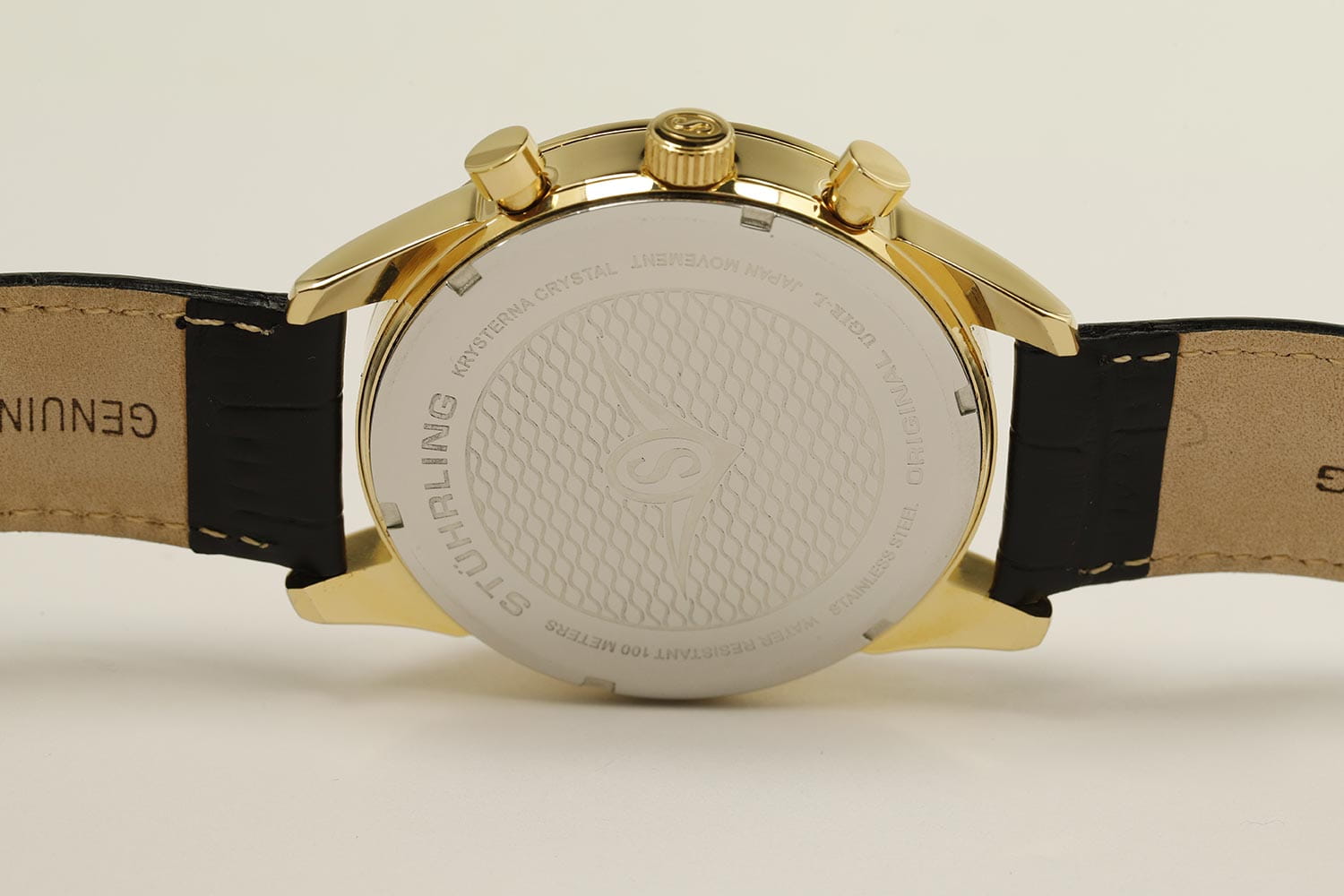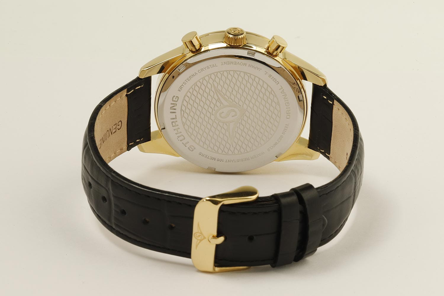 Stuhrling 3975L.5 — стильные мужские часы с выразительным пилотским дизайном и мощным функционалом. Классический циферблат дополнен контрастными счётчиками хронографаХронографФункция позволяет измерять отрезки времени с особой точностью: часы, минуты, секунды. Верным признаком хронографа является наличие на циферблате 3 дополнительных окошек-счётчиков., тахиметрической шкалой по ободу и аккуратным окошком даты, подчёркивающими технический характер модели. Корпус из нержавеющей стали с PVD-покрытиемPVDУльтратонкое покрытие наносится в технике вакуумного напыления, сочетает в себе нитрид титана особой прочности со слоем золота или оксида хрома. Несёт в себе декоративную или защитную функцию. придаёт часам надёжность и современный блеск, а стекло KrysternaKrysternaKrysterna — инновационное стекло для наручных часов. Благодаря уникальной структуре, Krysterna объединяет ключевые преимущества двух материалов: твердость сапфира, защищающую от царапин, и гибкость минерального стекла, обеспечивающую устойчивость к деформациям. Такая комбинация делает его идеальным решением для часов, подверженных экстремальным нагрузкам, сохраняя при этом оптическую прозрачность. защищает поверхность от царапин и сохраняет кристальную прозрачность. Кожаный ремень с классической текстурой аллигатора и стандартной застежкой, обеспечивает комфорт и элегантную посадку на запястье. Stuhrling — гармония силы, точности и изысканного стиля для мужчин, ценящих уверенность и безупречный вкус.