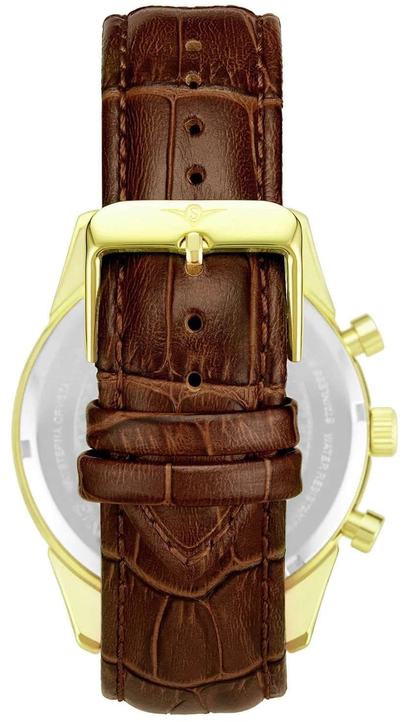 Stuhrling 3975L.8 — стильные мужские часы с выразительным пилотским дизайном и мощным функционалом. Классический циферблат дополнен контрастными счётчиками хронографаХронографФункция позволяет измерять отрезки времени с особой точностью: часы, минуты, секунды. Верным признаком хронографа является наличие на циферблате 3 дополнительных окошек-счётчиков., тахиметрической шкалой по ободу и аккуратным окошком даты, подчёркивающими технический характер модели. Корпус из нержавеющей стали с PVD-покрытиемPVDУльтратонкое покрытие наносится в технике вакуумного напыления, сочетает в себе нитрид титана особой прочности со слоем золота или оксида хрома. Несёт в себе декоративную или защитную функцию. придаёт часам надёжность и современный блеск, а стекло KrysternaKrysternaKrysterna — инновационное стекло для наручных часов. Благодаря уникальной структуре, Krysterna объединяет ключевые преимущества двух материалов: твердость сапфира, защищающую от царапин, и гибкость минерального стекла, обеспечивающую устойчивость к деформациям. Такая комбинация делает его идеальным решением для часов, подверженных экстремальным нагрузкам, сохраняя при этом оптическую прозрачность. защищает поверхность от царапин и сохраняет кристальную прозрачность. Кожаный ремень с классической текстурой аллигатора и стандартной застежкой, обеспечивает комфорт и элегантную посадку на запястье. Stuhrling — гармония силы, точности и изысканного стиля для мужчин, ценящих уверенность и безупречный вкус.
