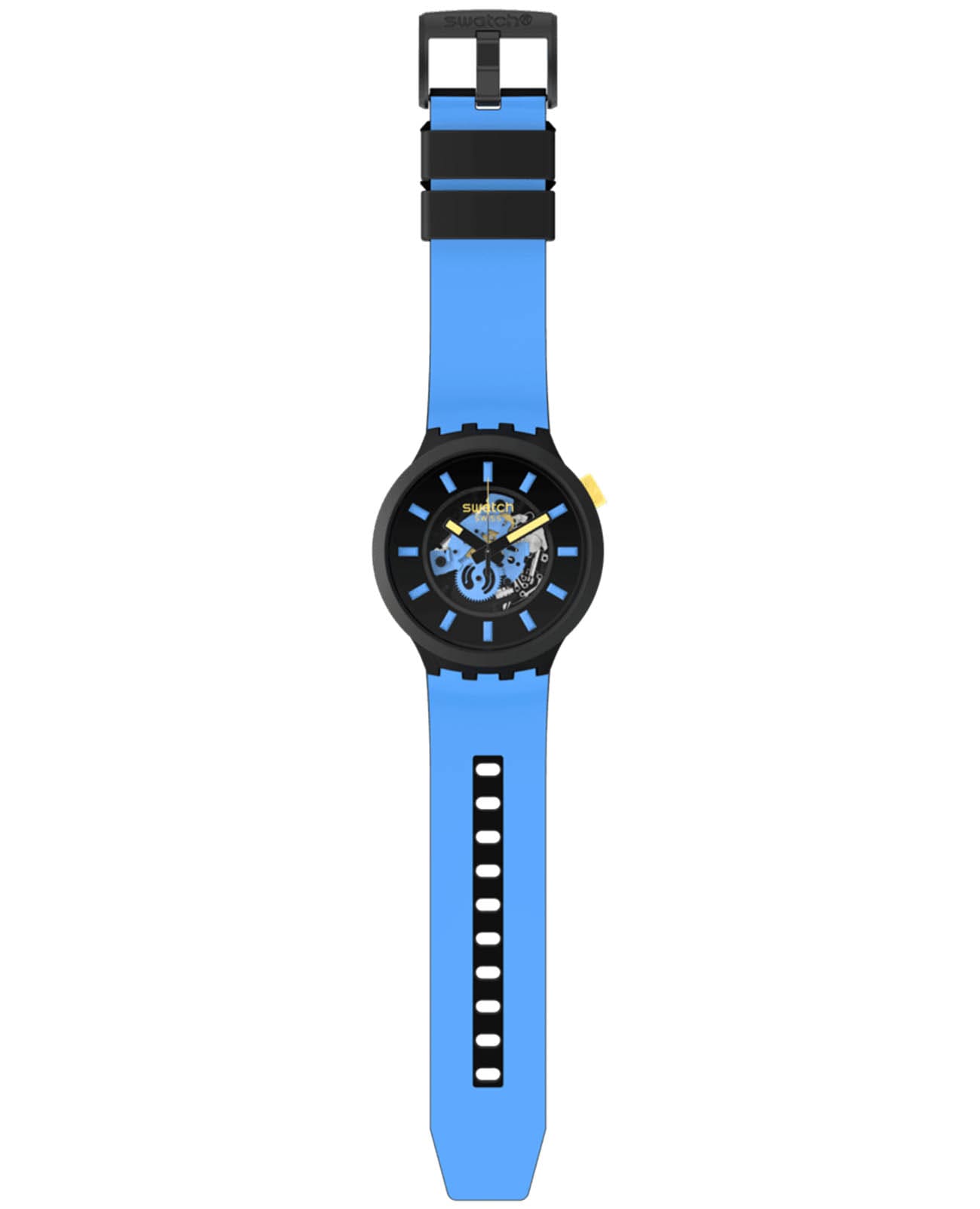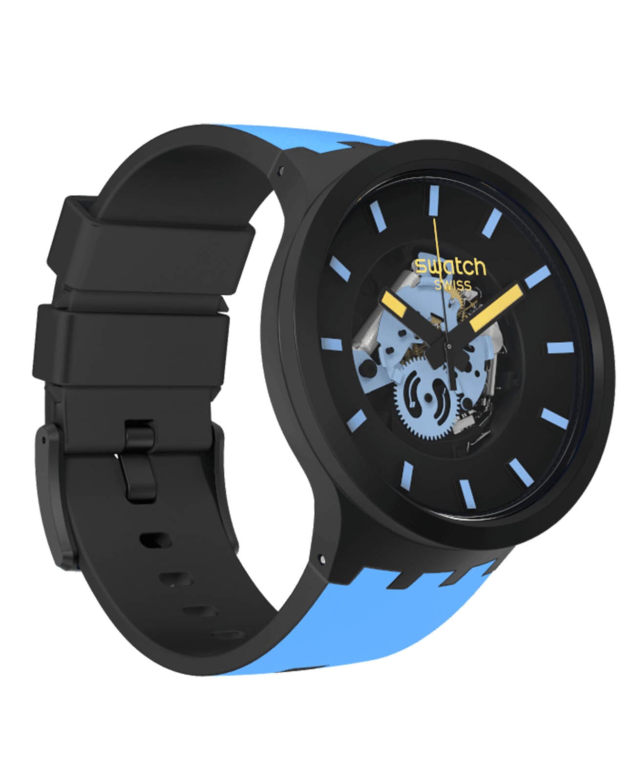 Часы Swatch SB03B108 — это стильный и современный аксессуар для тех, кто ценит лёгкость и комфорт. Часы идеально подойдут как для мужчин, так и для женщин. Центральный элемент этой модели часов — большой корпус со стеклом из био-материала, украшенный 3D-циферблатом с принтами на индексах. Корпус из биокерамикиБиокерамикаБиокерамика — это материал, который на две трети состоит из керамики, на одну треть — из биопластика. Он сочетает в себе лучшие качества обоих материалов и обладает прочностью и шелковистой на ощупь текстурой., а также силиконовые тренчики подчеркивают голубой принт на силиконовом ремешке этих огромных часов. На часовую, минутную стрелки нанесено люминесцентное покрытиеЛюминесцентное покрытиеПозволяет считывать показания времени в темноте. Производители наносят на стрелки, часовые индексы, безель или поверхность циферблата светонакопительный состав, дающий холодное свечение., которое светится в темноте, создавая необычное изображение. Водозащита 30 метров делает часы практичными для повседневного использования. Эти часы подойдут для повседневного ношения и станут ярким акцентом в вашем наряде.
