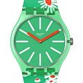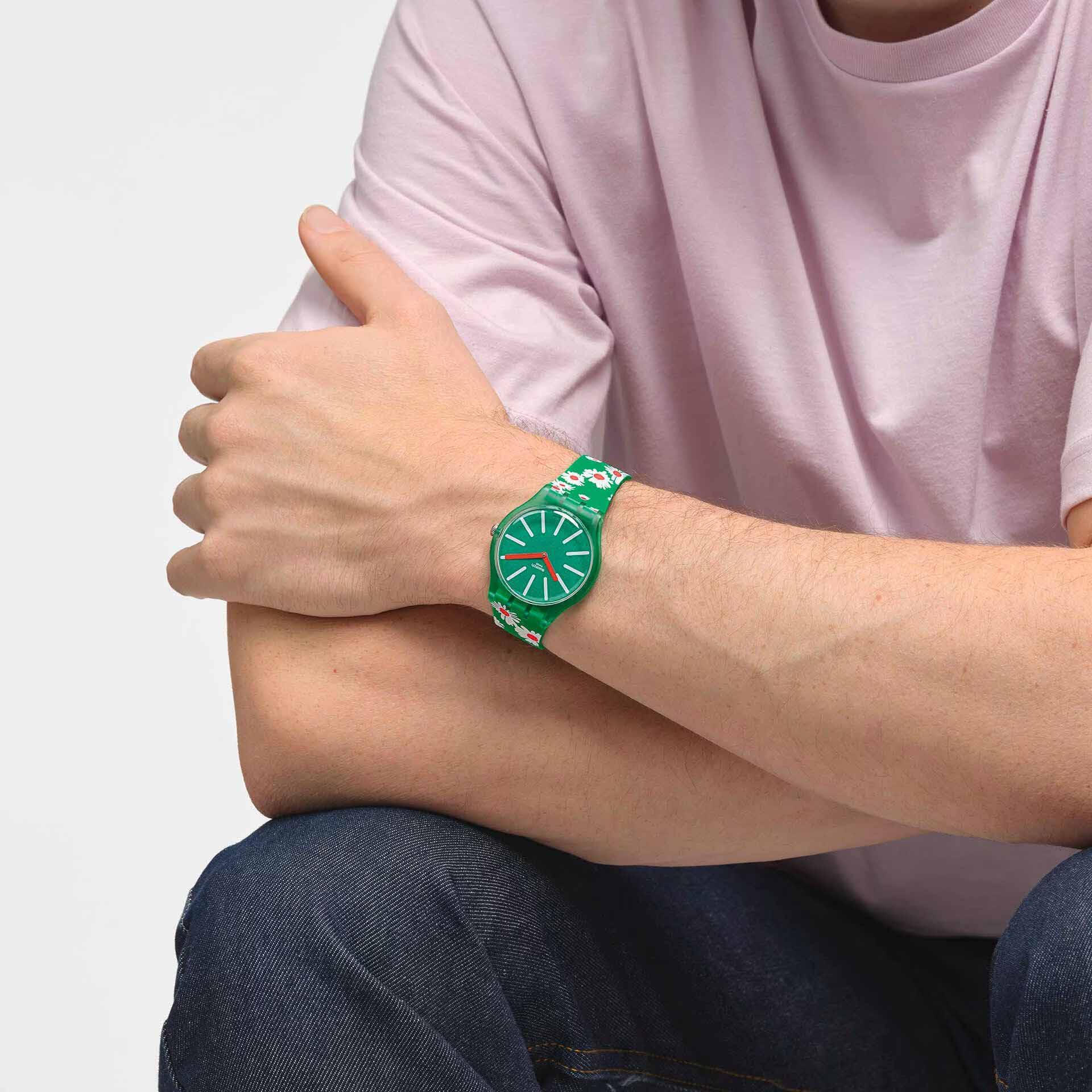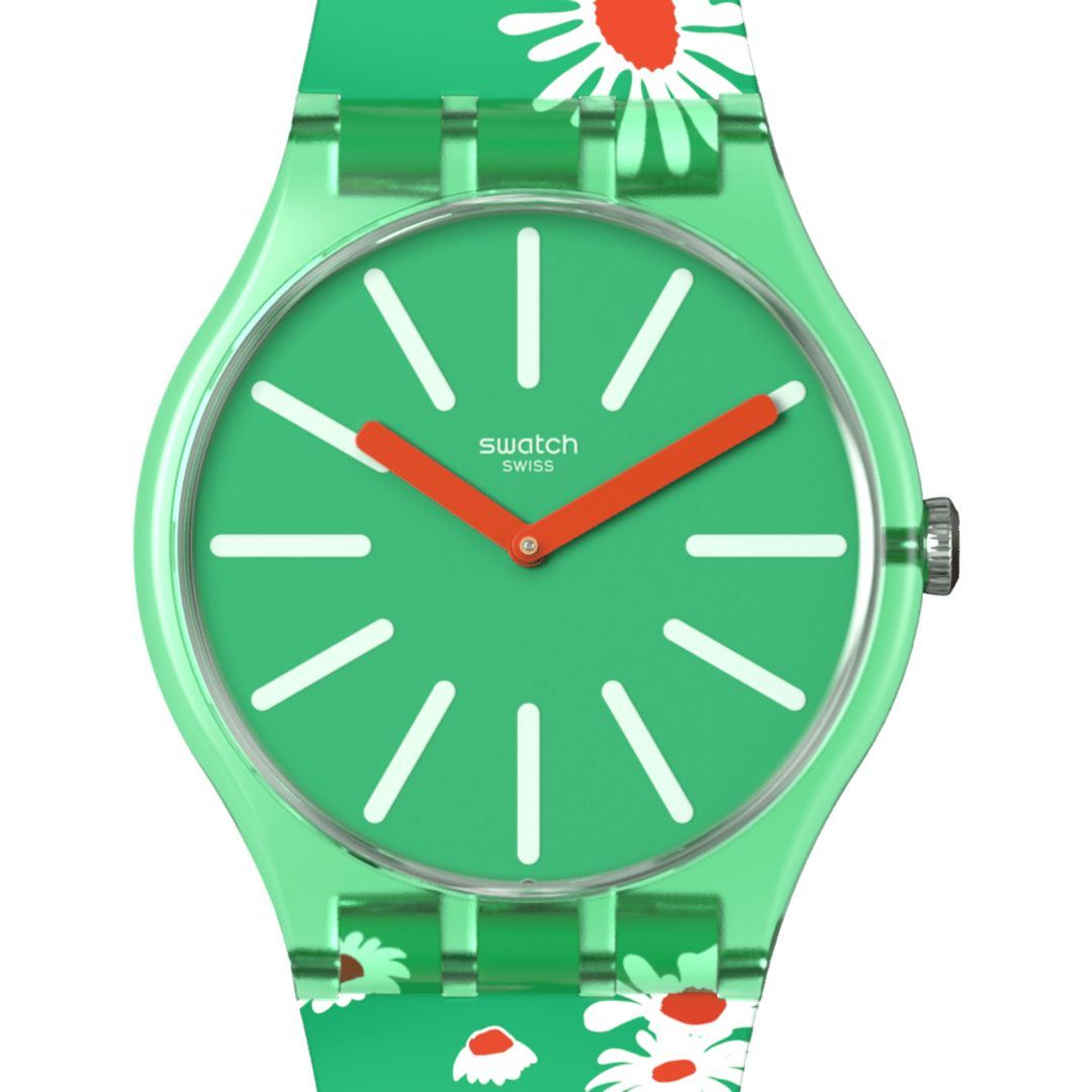 Часы Swatch SO29G104 —  стильный и надежный аксессуар. Эти позитивные часы имеют полупрозрачный зеленый корпус из биоматериала, зеленый силиконовый ремешок с ромашками, оранжевые стрелки и белые индексы. Циферблат покрыт биостеклом. Мерцающий блеск модели обусловлен особым методом гравированной отделки. Ремешок на классической застежке. Внутри часов установлен надежный кварцевый механизм, который обеспечивает точность хода. Эти часы водонепроницаемы до 30 метров, что позволяет не беспокоиться о случайных брызгах или дождевых каплях. Swatch SO29G104 — это идеальный выбор для тех, кто ценит сочетание стиля, комфорта и функциональности в одном аксессуаре.