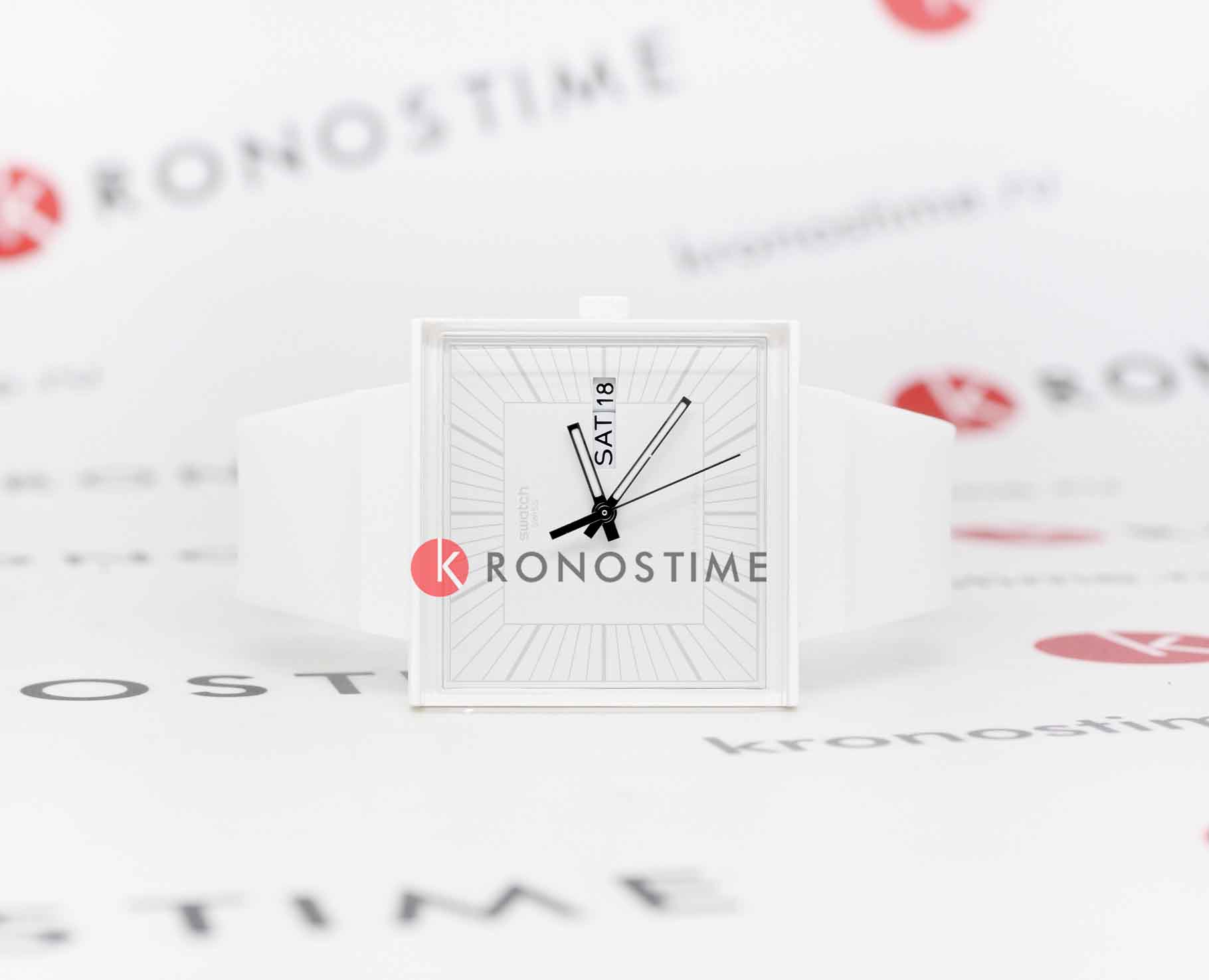 Swatch Square Bioceramic Standard SO34W700 "WHAT IF...ALLWHITE?" - это стильные квадратные часы с корпусом 41,8*41,8 мм из матовой биокерамики белого цвета. Модель оснащена кварцевым механизмом, окошком даты и дня недели, водонепроницаемостью до 20 метров. Часы имеют белый матовый ремешок из биоматериала, белый циферблат и стекло из биоматериала. Стрелки с люминесцентным покрытиемЛюминесцентное покрытиеПозволяет считывать показания времени в темноте. Производители наносят на стрелки, часовые индексы, безель или поверхность циферблата светонакопительный состав, дающий холодное свечение.. Эта экологичная модель унисекс сочетает инновационные материалы с необычным полностью белым дизайном с серебристыми индексами и стрелками, вдохновленным оригинальным Swatch 1983 года, и подходит для тех, кто ценит минимализм и заботу об окружающей среде.