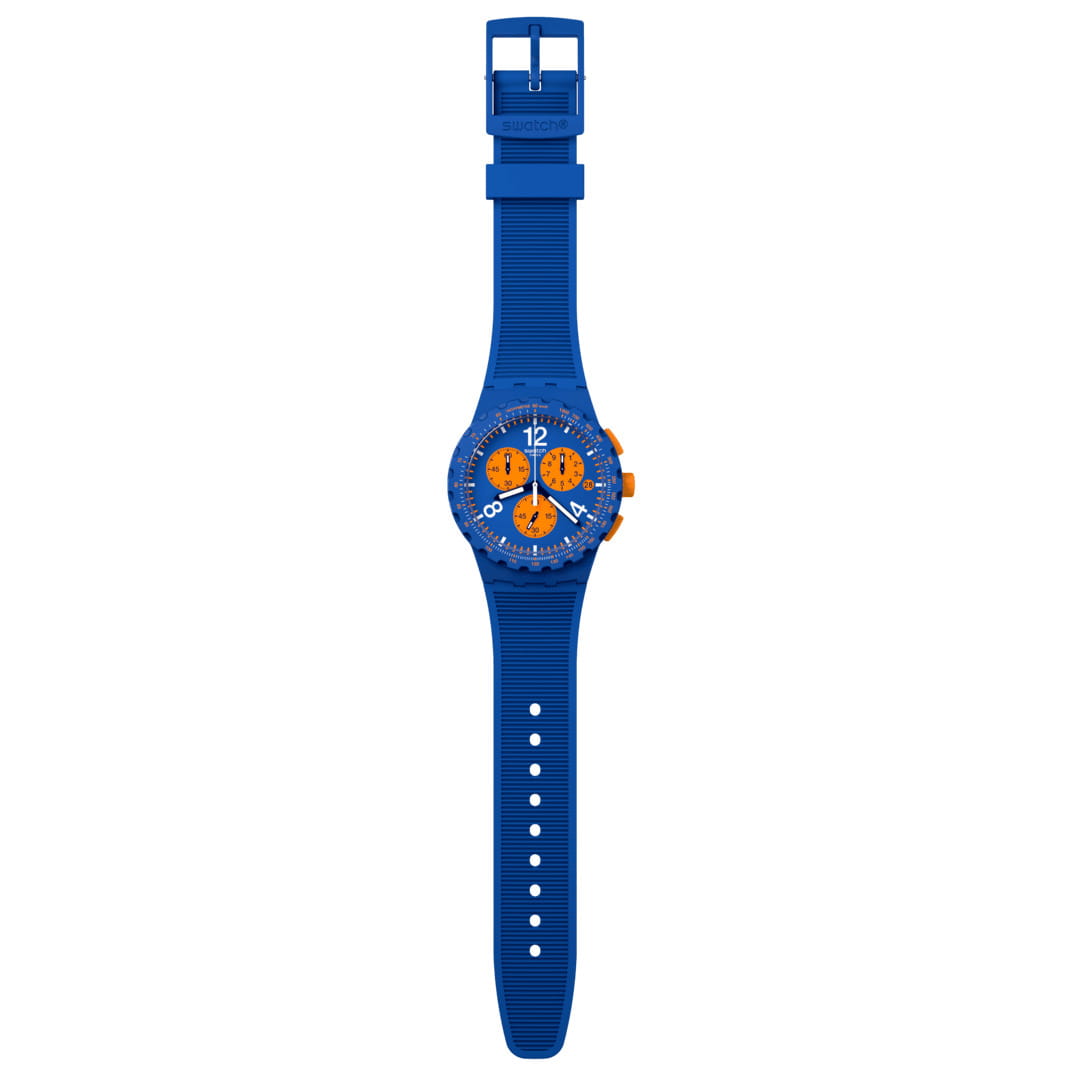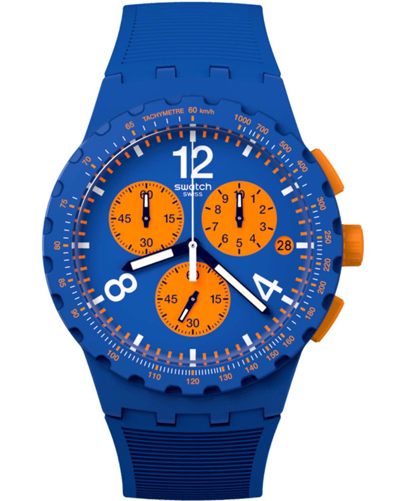Часы Swatch SUSN419 — это стильный и современный аксессуар для тех, кто ценит лёгкость и комфорт. Часы идеально подойдут как для мужчин, так и для женщин. На циферблате этого синего хронографаХронографФункция позволяет измерять отрезки времени с особой точностью: часы, минуты, секунды. Верным признаком хронографа является наличие на циферблате 3 дополнительных окошек-счётчиков. с контрастными оранжевыми и белыми принтами размещены стрелки и индексы, светящиеся в темноте благодаря люминесцентному покрытиюЛюминесцентное покрытиеПозволяет считывать показания времени в темноте. Производители наносят на стрелки, часовые индексы, безель или поверхность циферблата светонакопительный состав, дающий холодное свечение.. Яркую синюю однотонность спортивных часов довершают ремешок, тренчик и пряжка. Над фоне матового корпуса и такого же ремешка с тренчиком и пряжкой в тон рельефно выделяется синий безельБезельВнешний ободок, закрепляющий стекло. В спортивных часах так называется поворотное кольцо с делениями на циферблате, выполняет роль таймера – замеряет отрезки времени на шкале. Неподвижный безель – элемент декора. Однонаправленно вращающийся безель на дайверских часах позволяет фиксировать моменты погружения и выныривания на поверхность. с оранжевым принтом. Водозащита 30 метров делает часы практичными для повседневного использования. Эти часы подойдут для повседневного ношения и станут ярким акцентом в вашем наряде.