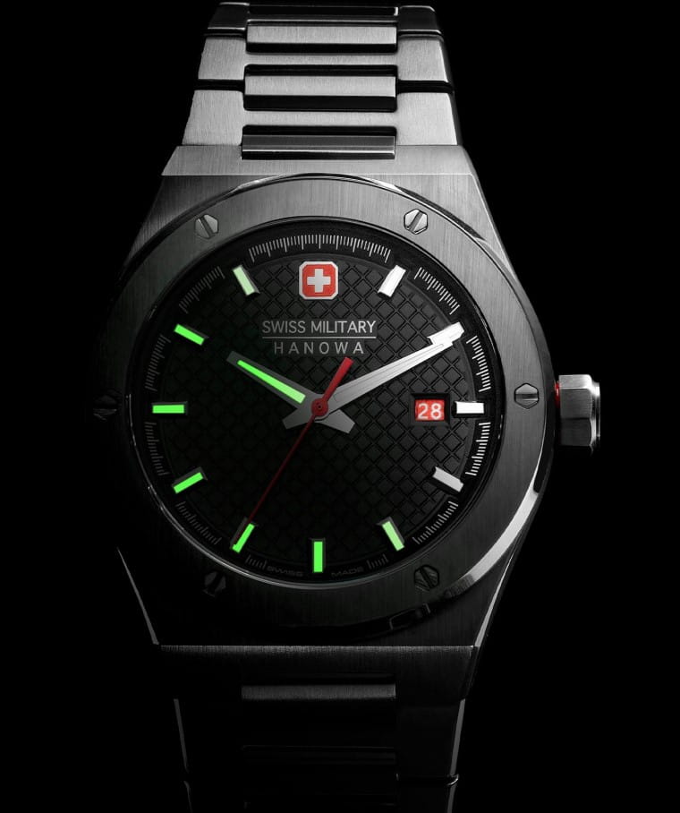 Мужские швейцарские часы с сапфировым стекломСапфировое стеклоПрочный и надёжный материал из кристалла сапфира синтетического происхождения, характеризующийся особой твёрдостью и устойчивостью к царапинам и повреждениям. Swiss Military Hanowa Sidewinder SMWGH2101604, кварцевый механизм с высокой точностью. Сапфировое стеклоСапфировое стеклоПрочный и надёжный материал из кристалла сапфира синтетического происхождения, характеризующийся особой твёрдостью и устойчивостью к царапинам и повреждениям. устойчивое к появлению царапин, обладающее высокой прозрачностью. Класс водозащиты: 100 метров, позволит плавать, нырять и заниматься другими водными видами спорта. Корпус часов изготовлен из стали. Стальной браслет на раскладной застёжкеРаскладная застёжкаТакой тип застёжки используется только на браслетах из металла. Она никогда не раскрывается полностью, происходит разделение на 2 и более частей. Раскладывающая застёжка снизит вероятность потери часов к минимуму..