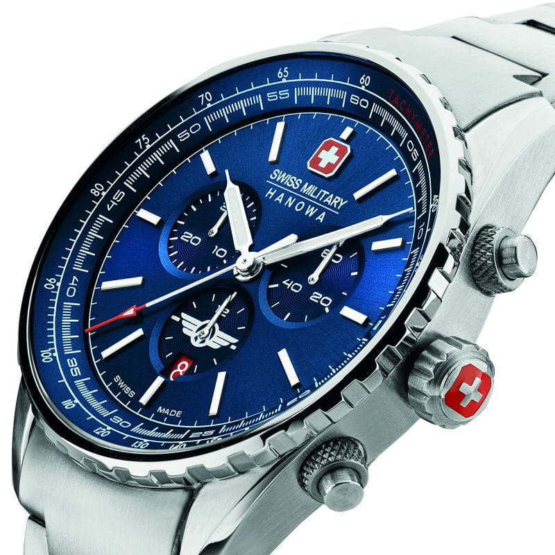 Мужские швейцарские часы-хронографХронографФункция позволяет измерять отрезки времени с особой точностью: часы, минуты, секунды. Верным признаком хронографа является наличие на циферблате 3 дополнительных окошек-счётчиков. Swiss Military Hanowa SMWGI0000304 с секундомеромСекундомерСекундоме́р — прибор, способный измерять интервалы времени с точностью до долей секунды., кварцевый механизм с высокой точностью. Сапфировое стеклоСапфировое стеклоПрочный и надёжный материал из кристалла сапфира синтетического происхождения, характеризующийся особой твёрдостью и устойчивостью к царапинам и повреждениям. устойчивое к появлению царапин, обладающее высокой прозрачностью. Класс водозащиты: 100 метров, позволит плавать, нырять и заниматься другими водными видами спорта. Корпус часов изготовлен из стали, серебристого цвета.