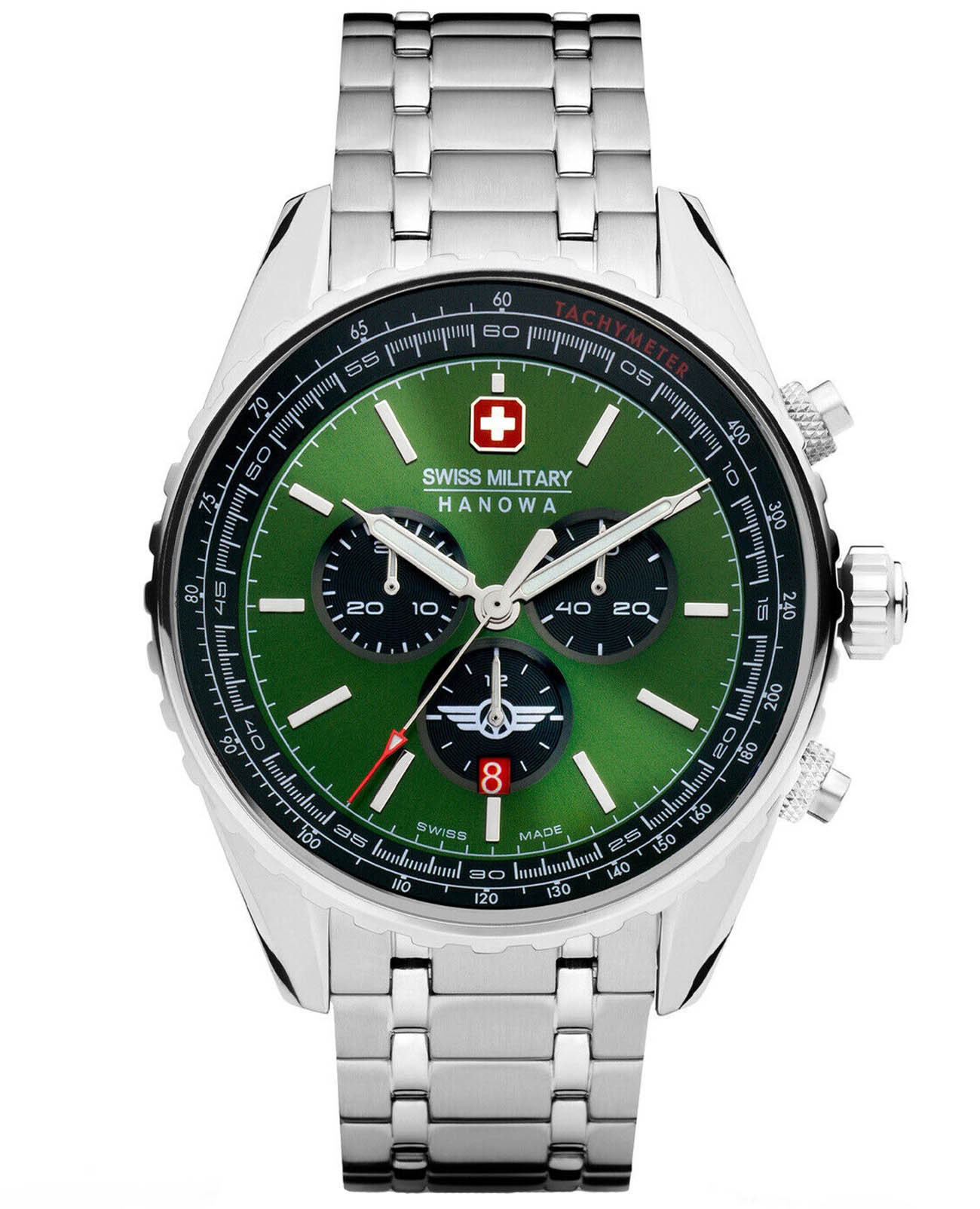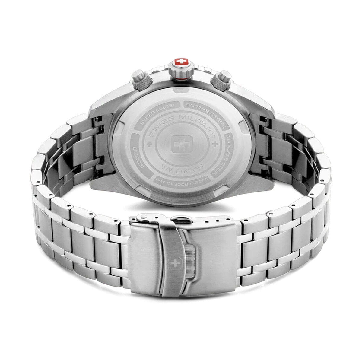 Мужские швейцарские часы с хронографомХронографФункция позволяет измерять отрезки времени с особой точностью: часы, минуты, секунды. Верным признаком хронографа является наличие на циферблате 3 дополнительных окошек-счётчиков. и секундомеромСекундомерСекундоме́р — прибор, способный измерять интервалы времени с точностью до долей секунды. Swiss Military Hanowa Afterburn Chrono SMWGI0000307, кварцевый механизм с высокой точностью. Сапфировое стеклоСапфировое стеклоПрочный и надёжный материал из кристалла сапфира синтетического происхождения, характеризующийся особой твёрдостью и устойчивостью к царапинам и повреждениям. устойчивое к появлению царапин, обладающее высокой прозрачностью. Класс водозащиты: 100 метров, позволит плавать, нырять и заниматься другими водными видами спорта. Корпус и браслет часов изготовлен из стали. Браслет с раскладной застёжкойРаскладная застёжкаТакой тип застёжки используется только на браслетах из металла. Она никогда не раскрывается полностью, происходит разделение на 2 и более частей. Раскладывающая застёжка снизит вероятность потери часов к минимуму..