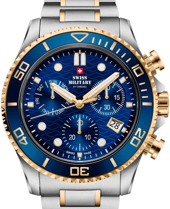Часы Swiss Military SM34101.04 — это элегантный мужской хронограф, объединяющий швейцарское качество и современный стиль. Корпус диаметром 46 мм выполнен из нержавеющей стали, что обеспечивает долговечность и надёжность. Синий вращающийся безельБезельВнешний ободок, закрепляющий стекло. В спортивных часах так называется поворотное кольцо с делениями на циферблате, выполняет роль таймера – замеряет отрезки времени на шкале. Неподвижный безель – элемент декора. Однонаправленно вращающийся безель на дайверских часах позволяет фиксировать моменты погружения и выныривания на поверхность. с золотистыми минутными метками и синий циферблат с крупными золотистыми стрелками создают стильный и запоминающийся облик.