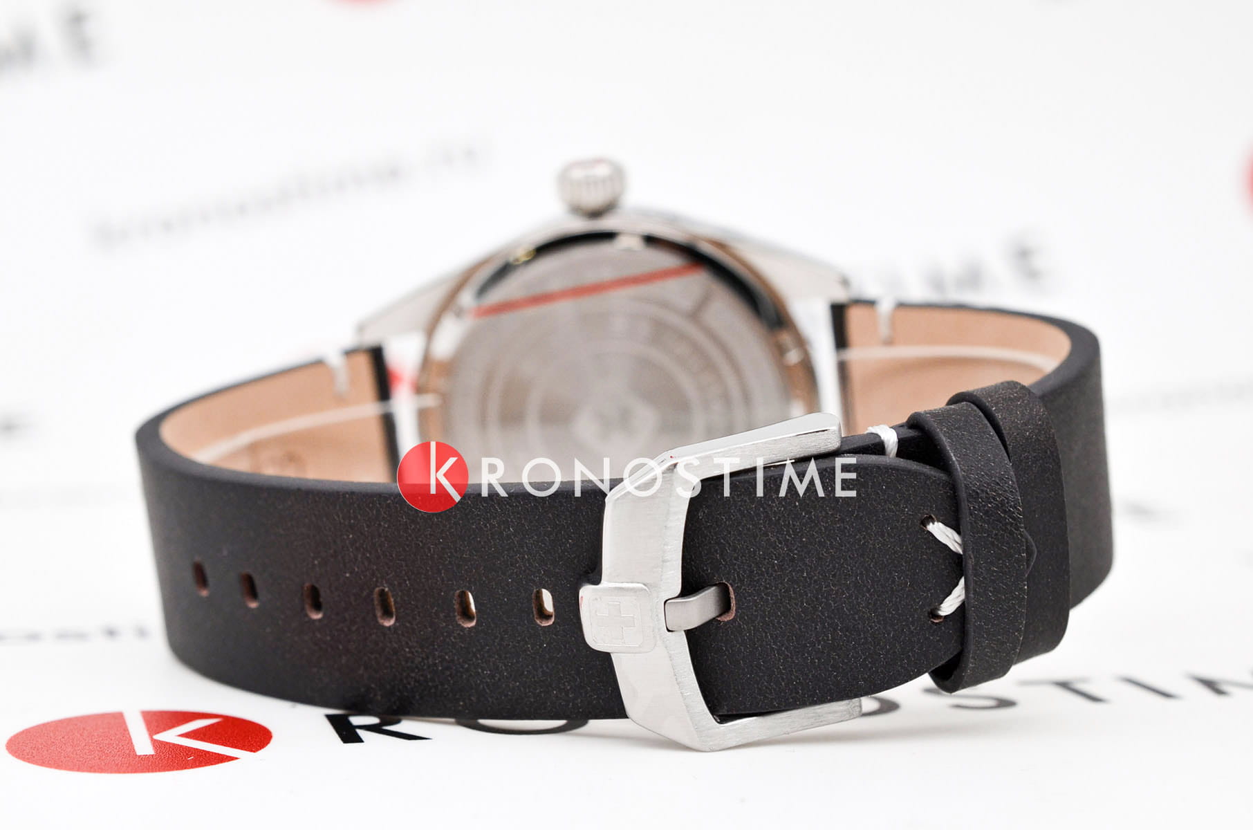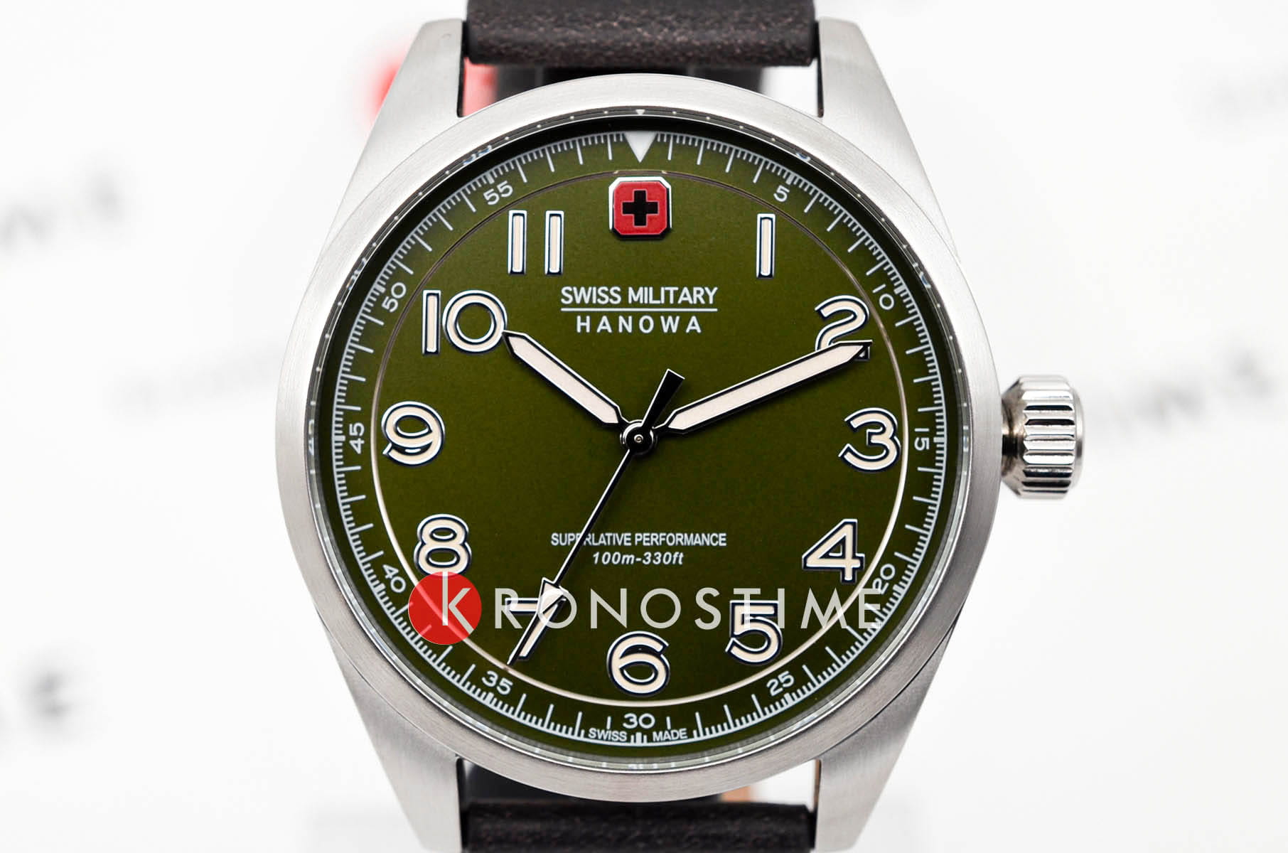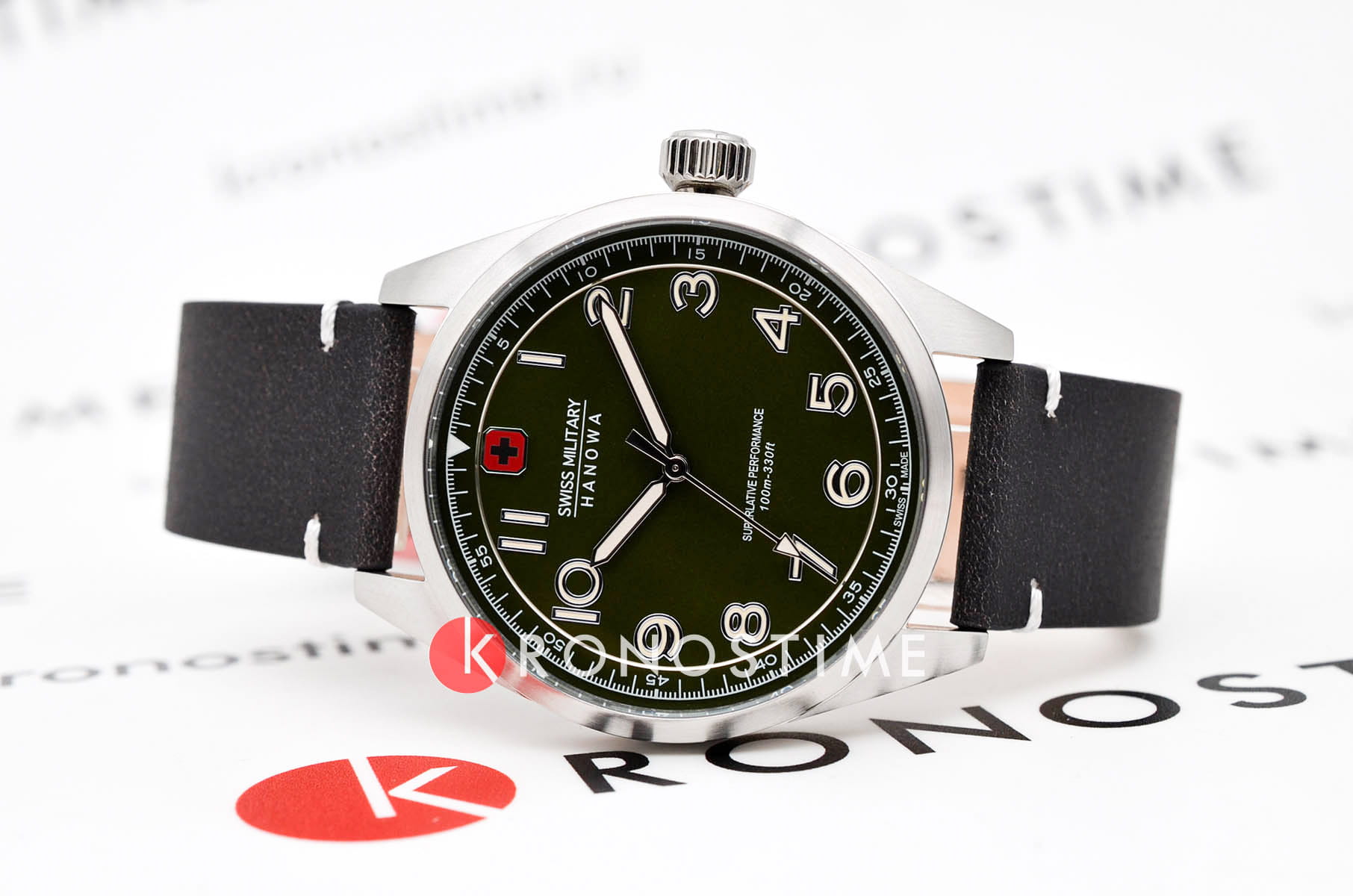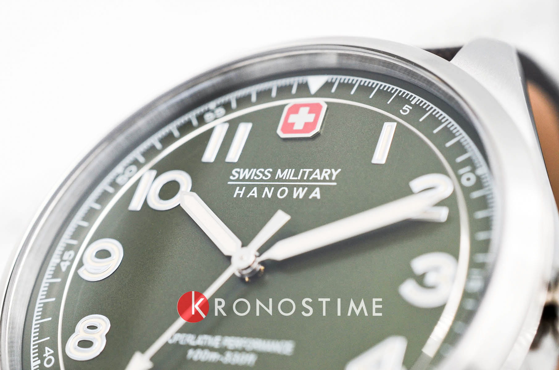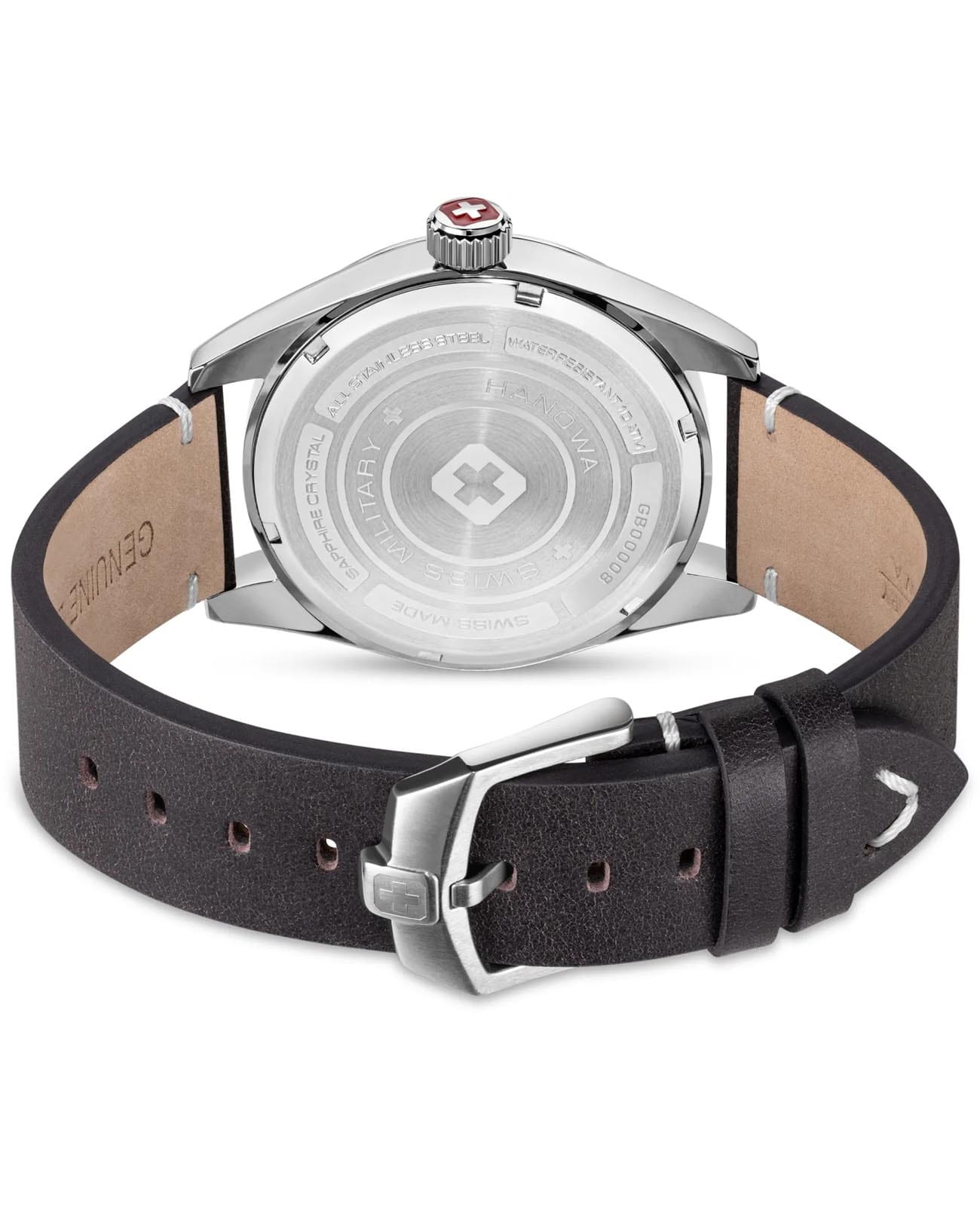 Мужские швейцарские часы Swiss Military Hanowa SMWGA2100404 с надёжным кварцевым механизмом. Сапфировое стеклоСапфировое стеклоПрочный и надёжный материал из кристалла сапфира синтетического происхождения, характеризующийся особой твёрдостью и устойчивостью к царапинам и повреждениям. устойчивое к мелким механическим повреждениям. Корпус часов изготовлен из нержавеющей стали. Кожаный браслет на стандартной застёжке. Стрелки и метки с люминесцентным покрытиемЛюминесцентное покрытиеПозволяет считывать показания времени в темноте. Производители наносят на стрелки, часовые индексы, безель или поверхность циферблата светонакопительный состав, дающий холодное свечение.. Окошко даты находится в положении 3 часа. Класс водозащиты: 100 метров, позволит плавать, нырять и заниматься другими водными видами спорта.