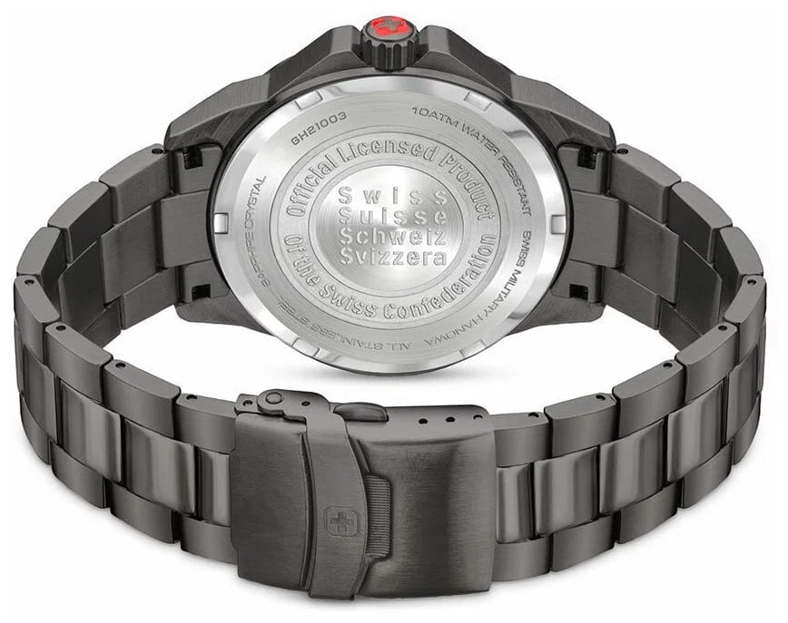 Швейцарские мужские часы Swiss Military Hanowa SMWGH2100341, кварцевый механизм с высокой точностью. Сапфировое стеклоСапфировое стеклоПрочный и надёжный материал из кристалла сапфира синтетического происхождения, характеризующийся особой твёрдостью и устойчивостью к царапинам и повреждениям. устойчивое к появлению царапин, обладающее высокой прозрачностью. Циферблат украшен декоративным узором Clous de Paris (Парижские гвозди). Часовая и минутная стрелки с люминесцентным покрытиемЛюминесцентное покрытиеПозволяет считывать показания времени в темноте. Производители наносят на стрелки, часовые индексы, безель или поверхность циферблата светонакопительный состав, дающий холодное свечение., которое светится в темноте после непродолжительной зарядки на свету. Класс водозащиты: 100 метров, позволит плавать, нырять и заниматься другими водными видами спорта. Корпус и браслет часов изготовлены из стали с IP-покрытиемIP-покрытиеМетод ионного напыления. Демонстрирует повышенную устойчивость к истиранию, окислению и химическим веществам. Под воздействием высокого давления и температуры около 1500°C молекулы металла надёжно соединяются с частицами корпуса часов. черного цвета. Окошки дня недели и даты находятся в положении 3 часа. Метки в виде арабских цифр, 12-ти часовая метка в виде фирменного логотипа. Рифленая заводная головка с защитой. Завинчивающаяся задняя крышка. Браслет с раскладной застёжкойРаскладная застёжкаТакой тип застёжки используется только на браслетах из металла. Она никогда не раскрывается полностью, происходит разделение на 2 и более частей. Раскладывающая застёжка снизит вероятность потери часов к минимуму.. Застежка с системой блокировки.