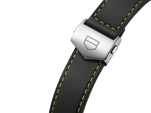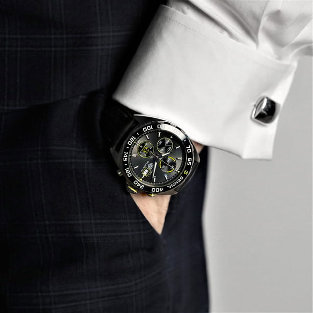 Швейцарские механические наручные часы-хронографХронографФункция позволяет измерять отрезки времени с особой точностью: часы, минуты, секунды. Верным признаком хронографа является наличие на циферблате 3 дополнительных окошек-счётчиков. TAG Heuer Formula 1 Senna Special Edition CAZ201B.FC6487 с секундомеромСекундомерСекундоме́р — прибор, способный измерять интервалы времени с точностью до долей секунды. и тахиметромТахиметрРазмеченная шкала, располагается на ободке или безеле часов. Тахиметр позволяет рассчитать скорость на определённом участке пути, расстояние измеряется в километрах или милях., механический механизм (автоматический калибр) с высокой точностью. Сапфировое стеклоСапфировое стеклоПрочный и надёжный материал из кристалла сапфира синтетического происхождения, характеризующийся особой твёрдостью и устойчивостью к царапинам и повреждениям. устойчивое к появлению царапин, обладающее высокой прозрачностью. Класс водозащиты: 200 метров, позволит плавать, нырять и заниматься другими водными видами спорта. Корпус часов изготовлен из стали. Кожаный ремешок с раскладной застёжкойРаскладная застёжкаТакой тип застёжки используется только на браслетах из металла. Она никогда не раскрывается полностью, происходит разделение на 2 и более частей. Раскладывающая застёжка снизит вероятность потери часов к минимуму.. Кнопки двойной блокировки и система увеличения длины. Окошко даты находится в положении 3 часа. Счетчики на 1/4 секунды, 30-минутный и 12-часовой. В механизме 25 камней, частота 28800 полуколебаний в час. Запас хода около 42 часов. Керамический безельБезельВнешний ободок, закрепляющий стекло. В спортивных часах так называется поворотное кольцо с делениями на циферблате, выполняет роль таймера – замеряет отрезки времени на шкале. Неподвижный безель – элемент декора. Однонаправленно вращающийся безель на дайверских часах позволяет фиксировать моменты погружения и выныривания на поверхность. вращается в одном направлении. Завинчивающаяся заводная головка с защитой. Завинчивающаяся задняя крышка украшена изображением гоночного шлема. Накладные индексы с родиевым покрытием. Стрелки и метки с люминесцентным покрытиемЛюминесцентное покрытиеПозволяет считывать показания времени в темноте. Производители наносят на стрелки, часовые индексы, безель или поверхность циферблата светонакопительный состав, дающий холодное свечение..