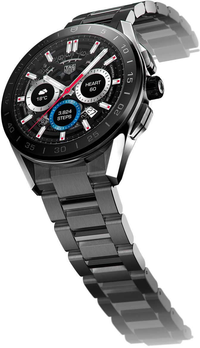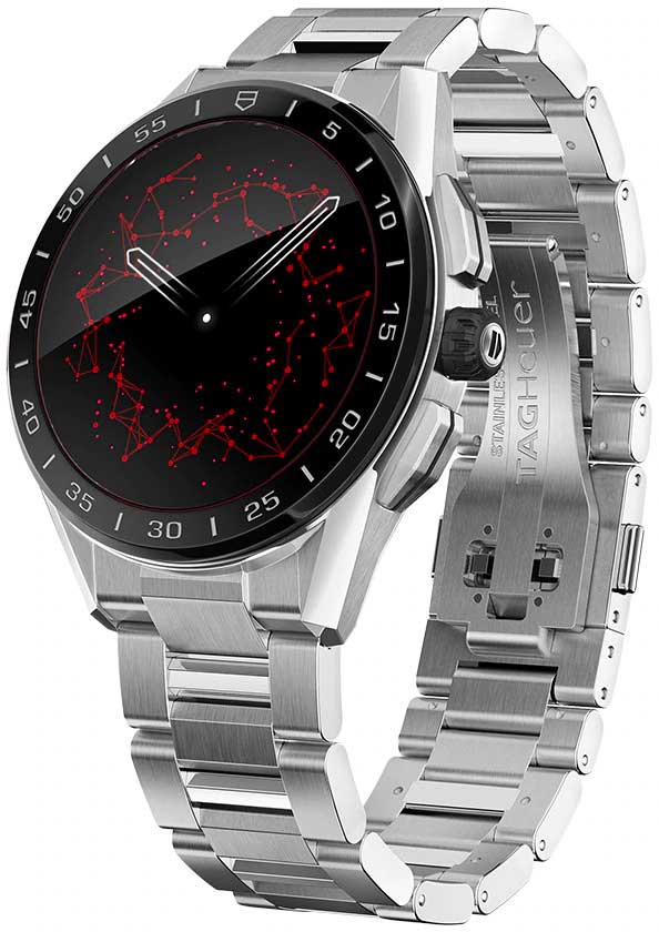 Новое поколение смарт-часов от TAG Heuer - это образец мастерства бренда, воплощающего в себе передовые технологии двадцать первого века. Эти часы – идеальный выбор для ценителей часового искусства и приверженцев активного образа жизни. Connected. Унисекс. Смарт-часы работают на базе четырехъядерного процессора Qualcomm® Snapdragon™ Wear 3100 и оснащены операционной системой Wear OS от Google. Совместимы с ОС Android 6.0+ (исключая версию Go) и iOS 10.0+. Встроенная система бесконтактной оплаты NFC (Google Pay). Микрофон. Голосовой помощник Google Assistant и Google Translate. Возможность установка приложений из Google Play. Возможность управления функциями телефона как через сенсорный дисплей, так и через функциональные кнопки и заводную головку. Подключение к интернету через Wi-Fi или с помощью интернета мобильного телефона. Синхронизация со смартфоном через Bluetooth. Поддержка спортивных онлайн-сообществ. Совместимость с приложением TAG Heuer Sports. Настраиваемые экраны: скелетонизированный циферблат мануфактурного механизма Heuer 02, цифровой механизм Carrera Heuer 01, анимация Orbital на основе уникальной нейросетевой модели, а также дисплей, вдохновленный фирменной спиралью баланса из углеродного композита на основе гексагональных нанотрубок. Настраиваемая подсветка (яркость/режим). Цветной сенсорный дисплей на органических светодиодах (OLED) размером 1,39'' и разрешением 454х454 пикселей (326 ppi). Второй часовой пояс. SPLIT-хронограф. Сервисы навигации GPS, GLONASS, BeiDou и QZSS. Пульсометр, компас, акселерометр, гироскоп, секундомер, таймер и будильник. Мониторинг количества израсходованных калорий. Вибро-оповещение. Перезаряжаемый аккумулятор 430мАч, которого хватает на сутки, включая часовую тренировку. Время полной подзарядки 1,5 часа. Керамический безель. Круглый корпус. Задняя крышка корпуса с винтовым креплением. Стальной браслет с системой быстрой замены. Раскладывающаяся застежка из титана. В комплект входят магнитное зарядное устройство аккумулятора и специальный дорожный чехол.