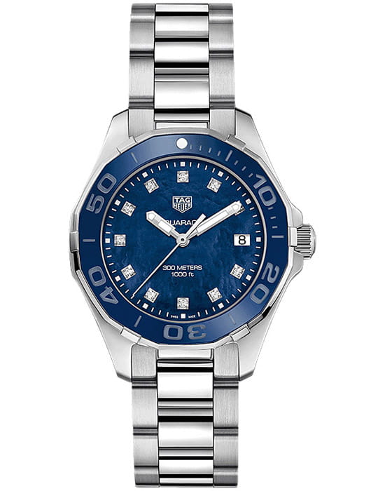 TAG Heuer Aquaracer WAY131L.BA0748 — элегантные женские часы, сочетающие стиль и функциональность. Корпус диаметром 35 мм и толщиной 10,75 мм выполнен из полированной нержавеющей стали, обеспечивая долговечность и устойчивость к коррозии. Лакированный циферблат оснащён накладными часовыми метками и стрелками с люминесцентным покрытиемЛюминесцентное покрытиеПозволяет считывать показания времени в темноте. Производители наносят на стрелки, часовые индексы, безель или поверхность циферблата светонакопительный состав, дающий холодное свечение., обеспечивающим отличную читаемость в любых условиях освещения. Его поверхность защищена сапфировым стекломСапфировое стеклоПрочный и надёжный материал из кристалла сапфира синтетического происхождения, характеризующийся особой твёрдостью и устойчивостью к царапинам и повреждениям., устойчивым к царапинам. Циферблат украшен 11 бриллиантами. Часы оснащены точным кварцевым механизмом, обеспечивающим стабильное отображение времени. Функциональность включает индикацию часов, минут, секунд и даты, расположенной на отметке «3 часа». БезельБезельВнешний ободок, закрепляющий стекло. В спортивных часах так называется поворотное кольцо с делениями на циферблате, выполняет роль таймера – замеряет отрезки времени на шкале. Неподвижный безель – элемент декора. Однонаправленно вращающийся безель на дайверских часах позволяет фиксировать моменты погружения и выныривания на поверхность. однонаправленный вращающийся, выполнен из стали, устойчивой к царапинам. Водозащита до 300 метров (30 бар) делает модель подходящей для дайвинга и активного образа жизни. Стальной браслет на раскладной застёжкеРаскладная застёжкаТакой тип застёжки используется только на браслетах из металла. Она никогда не раскрывается полностью, происходит разделение на 2 и более частей. Раскладывающая застёжка снизит вероятность потери часов к минимуму..