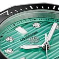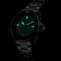 Механический механизм (автоматический калибр) с высокой точностью. Сапфировое стеклоСапфировое стеклоПрочный и надёжный материал из кристалла сапфира синтетического происхождения, характеризующийся особой твёрдостью и устойчивостью к царапинам и повреждениям. устойчивое к появлению царапин, обладающее высокой прозрачностью. Стрелки с люминесцентным покрытиемЛюминесцентное покрытиеПозволяет считывать показания времени в темноте. Производители наносят на стрелки, часовые индексы, безель или поверхность циферблата светонакопительный состав, дающий холодное свечение.. Вращающийся керамический безельБезельВнешний ободок, закрепляющий стекло. В спортивных часах так называется поворотное кольцо с делениями на циферблате, выполняет роль таймера – замеряет отрезки времени на шкале. Неподвижный безель – элемент декора. Однонаправленно вращающийся безель на дайверских часах позволяет фиксировать моменты погружения и выныривания на поверхность.. Класс водозащиты: 300 метров, позволит плавать, нырять и заниматься другими водными видами спорта. Корпус часов изготовлен из нержавеющей стали. Браслет с двойной застежкой с системой блокировки, открывающаяся нажатием кнопки.